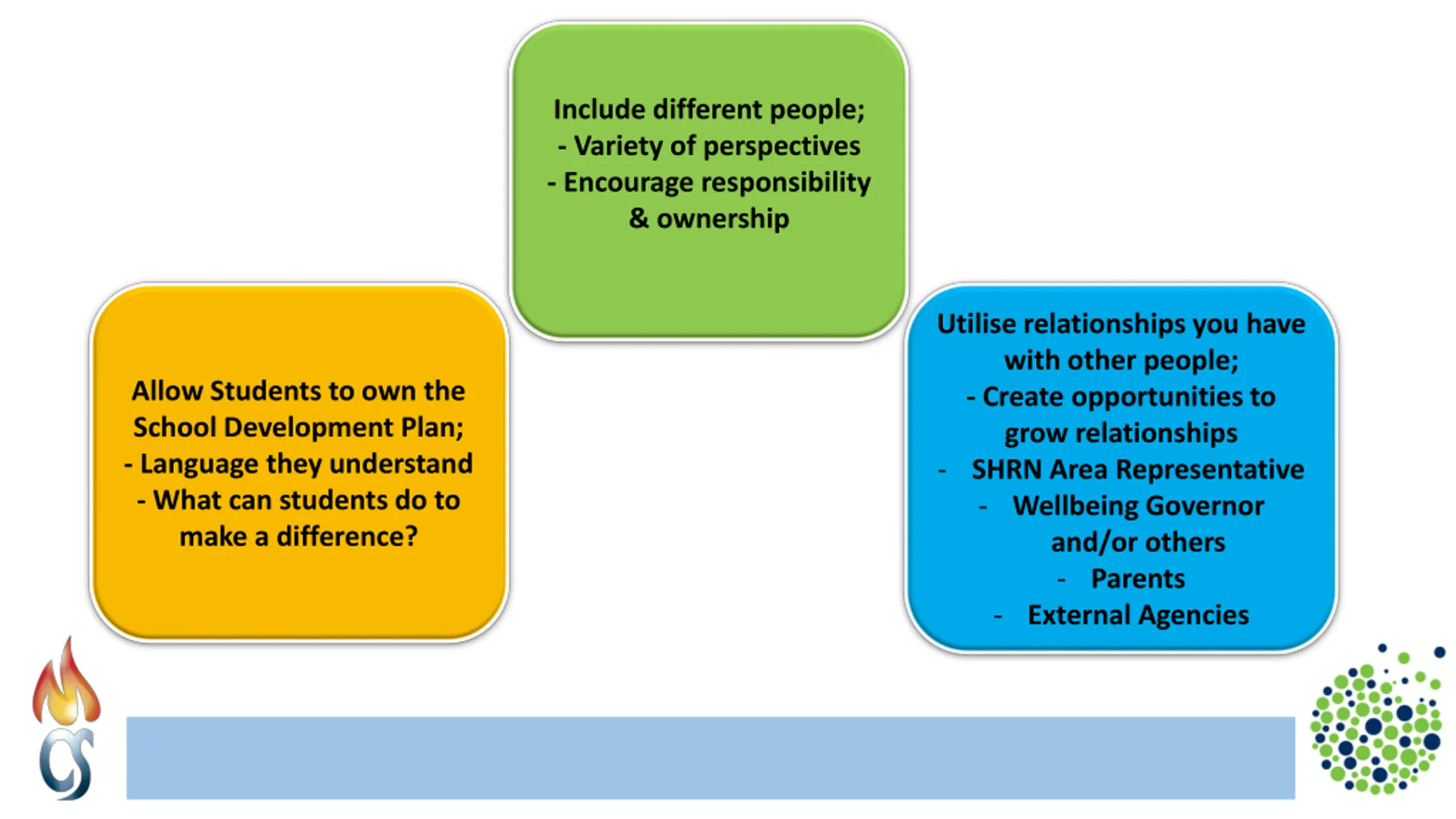 Include different people; - Variety of perspectives - Encourage responsibility & ownership Utilise relationships you have with other people; - Create opportunities to grow relationships - SHRN Area Representative - Wellbeing Governor and/or others - Parents - External Agencies Allow Students to own the School Development Plan; - Language they understand - What can students do to make a difference?