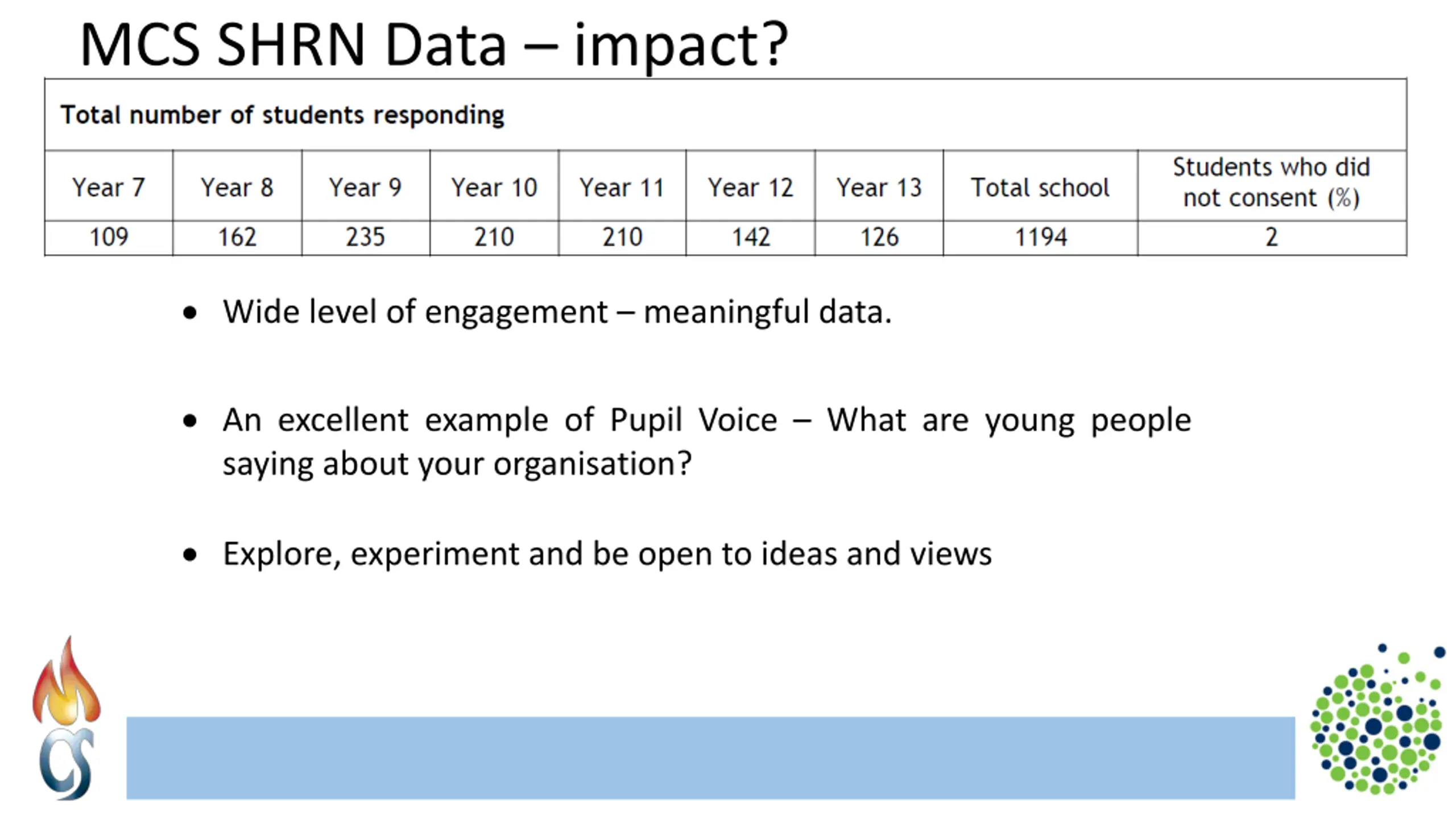 MCS SHRN Data impact? Wide level of engagement meaningful data. An excellent example of Pupil Voice What are young people saying about your organisation? Explore, experiment and be open to ideas and views