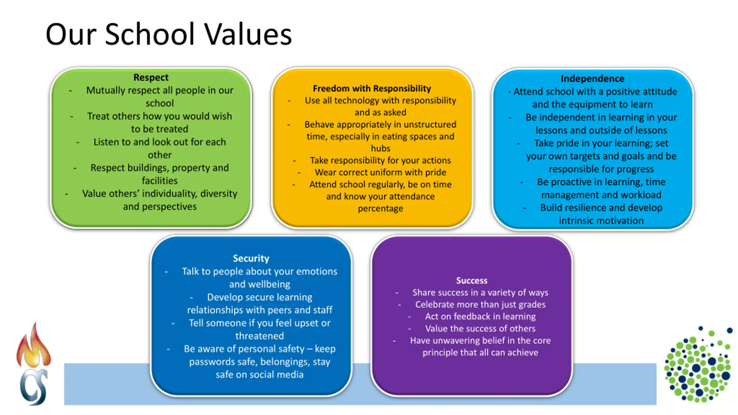 Our School Values Respect Independence Freedom with Responsibility Use all technology with responsibility and as asked Behave appropriately in unstructured time, especially in eating spaces and hubs Take responsibility for your actions Wear correct uniform with pride Attend school regularly, be on time and know your attendance percentage - Mutually respect all people in our school Treat others how you would wish to be treated Listen to and look out for each other Respect buildings, property and facilities Value others individuality, diversity and perspectives - Attend school with a positive attitude and the equipment to learn - Be independent in learning in your lessons and outside of lessons - Take pride in your learning; set your own targets and goals and be responsible for progress - Be proactive in learning, time management and workload - Build resilience and develop intrinsic motivation - - - - - - - - - Security - Talk to people about your emotions and wellbeing - Develop secure learning relationships with peers and staff Tell someone if you feel upset or threatened Be aware of personal safety keep passwords safe, belongings, stay safe on social media Success - Share success in a variety of ways Celebrate more than just grades Act on feedback in learning Value the success of others Have unwavering belief in the core principle that all can achieve - - - - - -