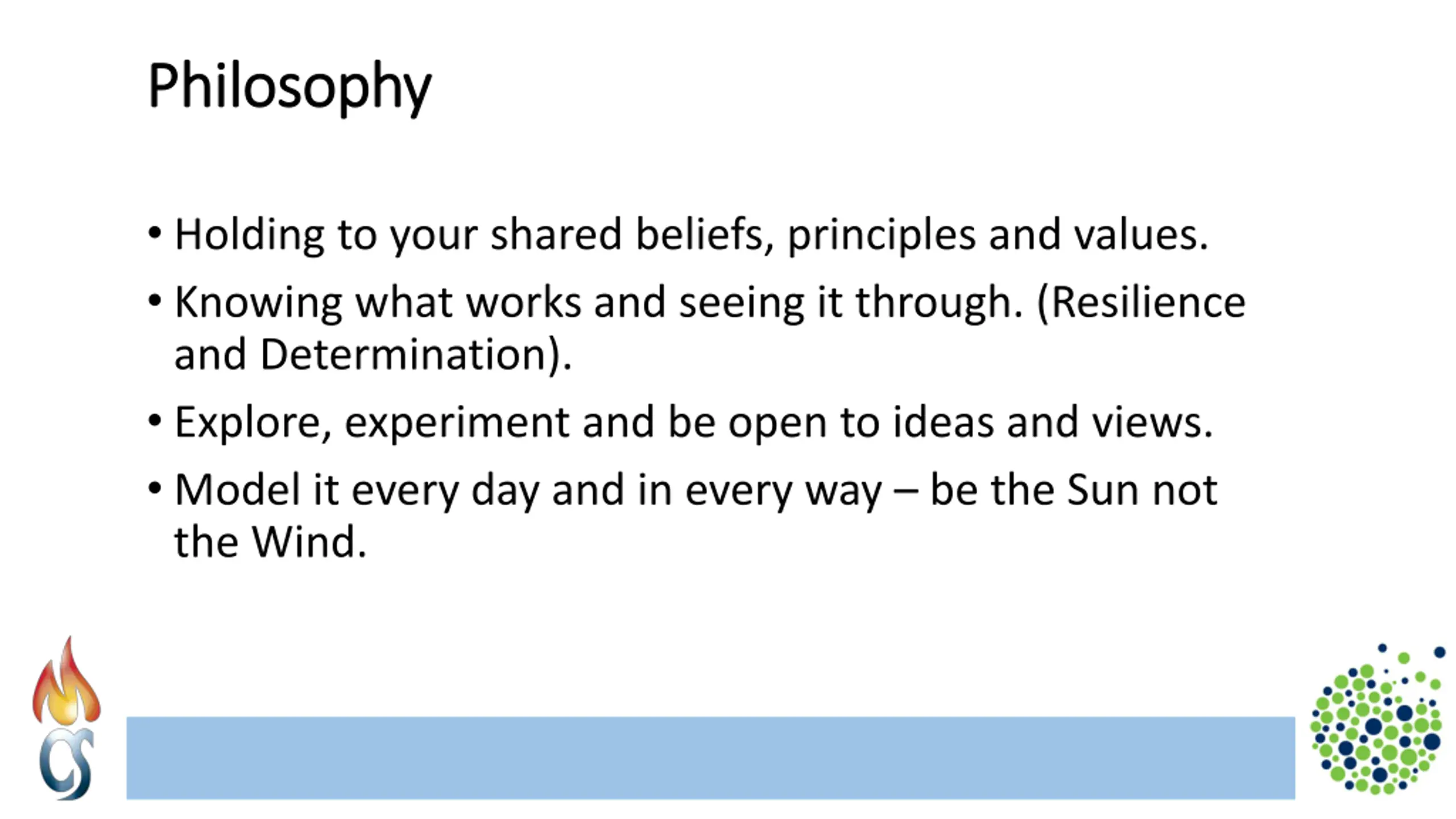 Philosophy Philosophy Holding to your shared beliefs, principles and values. Knowing what works and seeing it through. (Resilience and Determination). Explore, experiment and be open to ideas and views. Model it every day and in every way be the Sun not the Wind.