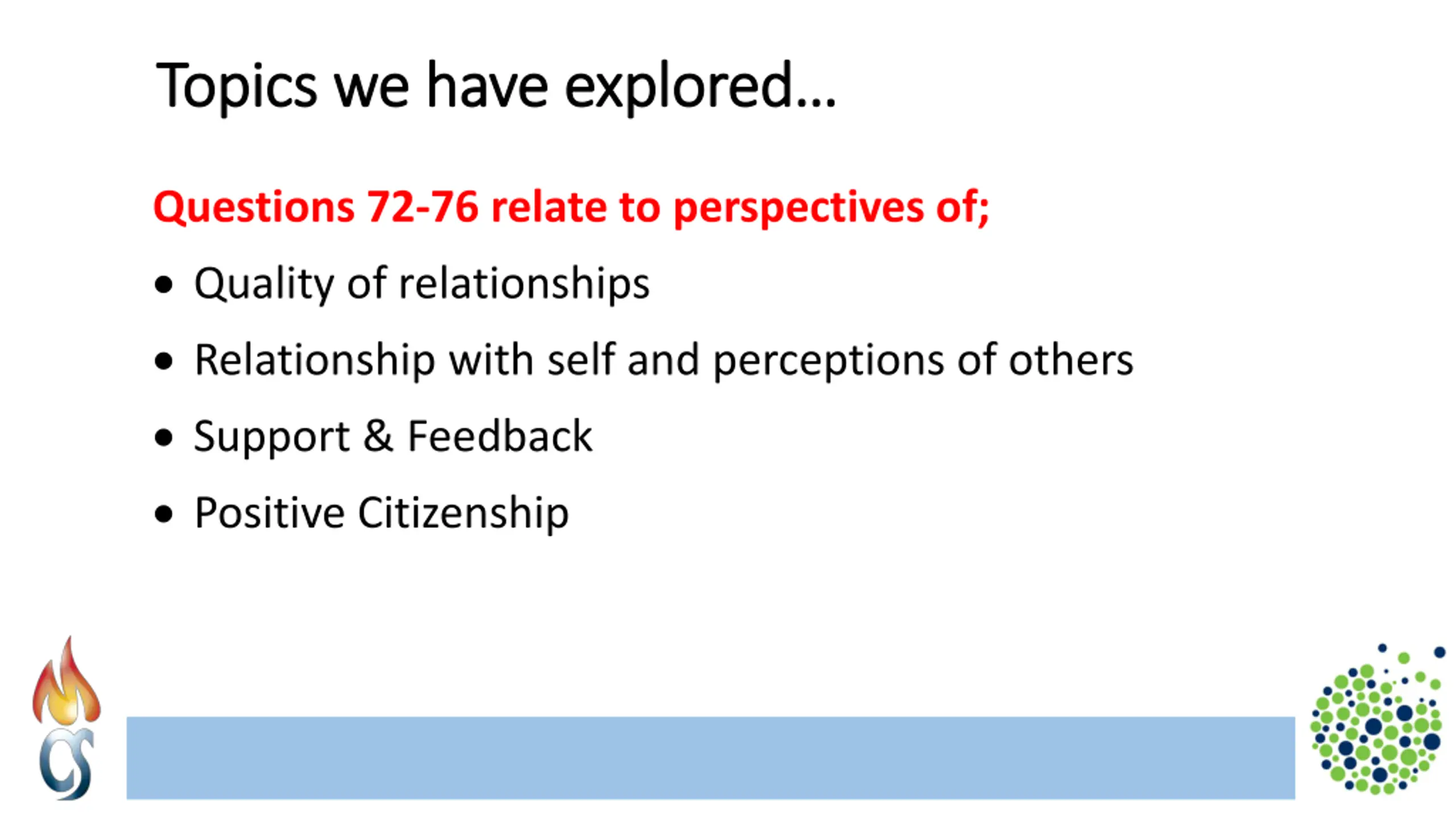 Topics we have explored Topics we have explored Questions 72-76 relate to perspectives of; Quality of relationships Relationship with self and perceptions of others Support & Feedback Positive Citizenship