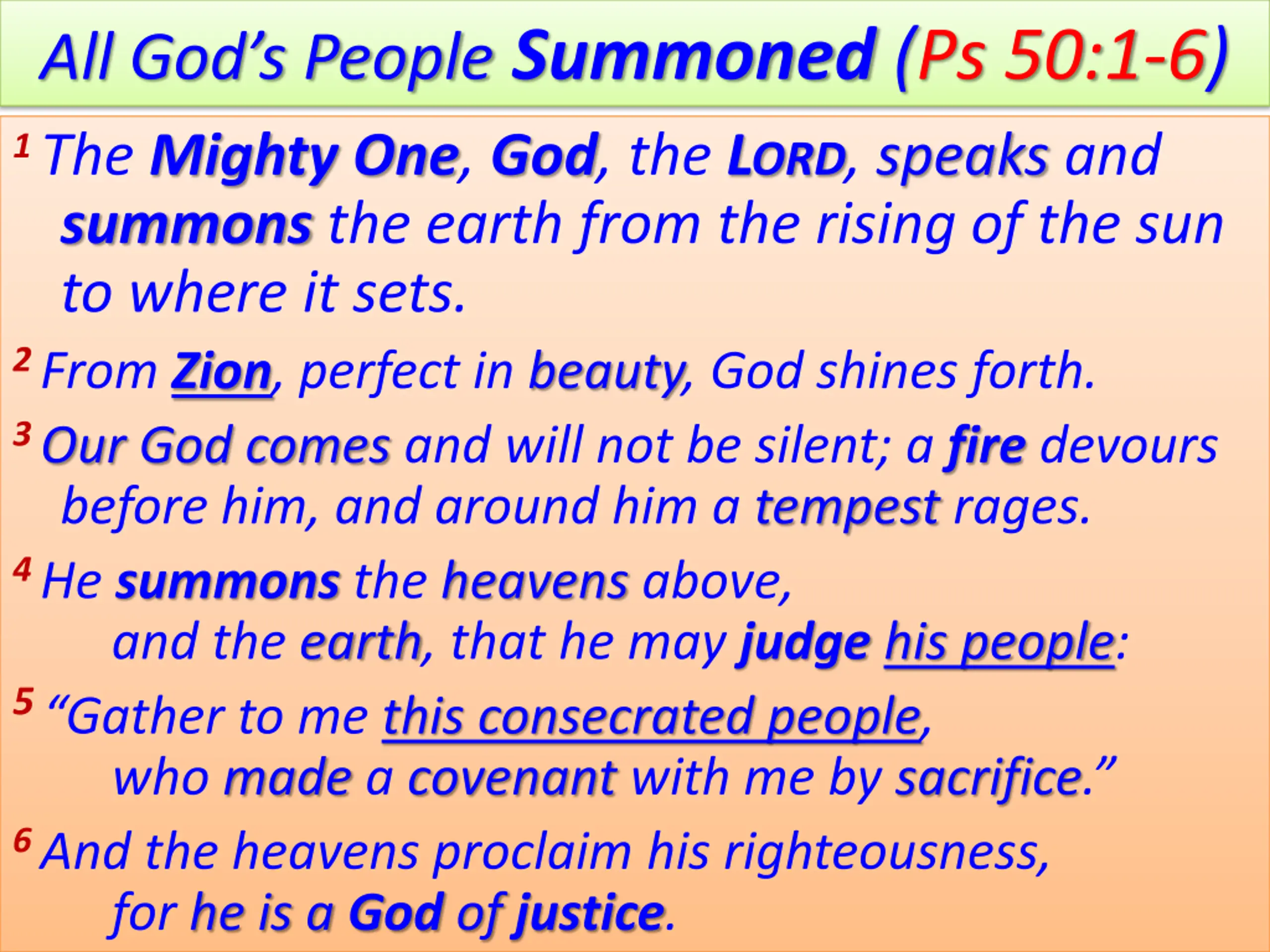 All Gods People Summoned (Ps 50:1-6) 1The Mighty One, God, the LORD, speaks and summons the earth from the rising of the sun to where it sets. 2From Zion, perfect in beauty, God shines forth. 3Our God comes and will not be silent; a fire devours before him, and around him a tempest rages. 4He summons the heavens above, and the earth, that he may judge his people: 5 Gather to me this consecrated people, who made a covenant with me by sacrifice. 6And the heavens proclaim his righteousness, for he is a God of justice.