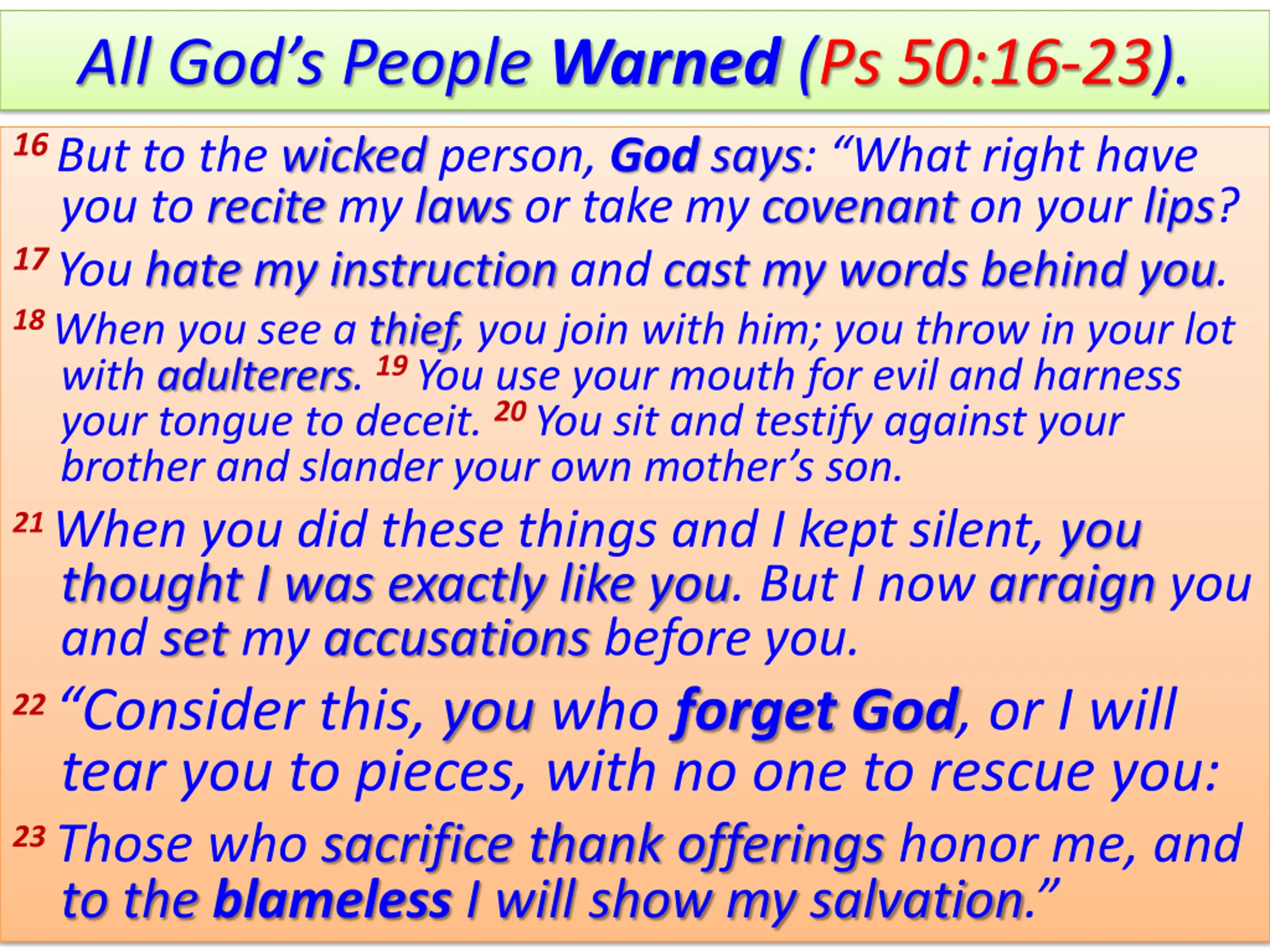 All Gods People Warned (Ps 50:16-23). 16But to the wicked person, God says: What right have you to recite my laws or take my covenant on your lips? 17You hate my instruction and cast my words behind you. 18When you see a thief, you join with him; you throw in your lot with adulterers. 19You use your mouth for evil and harness your tongue to deceit. 20You sit and testify against your brother and slander your own mother s son. 21When you did these things and I kept silent, you thought I was exactly like you. But I now arraign you and set my accusations before you. 22 Consider this, you who forgetGod, or I will tear you to pieces, with no one to rescue you: 23Those who sacrifice thank offerings honor me, and to the blameless I will show my salvation.
