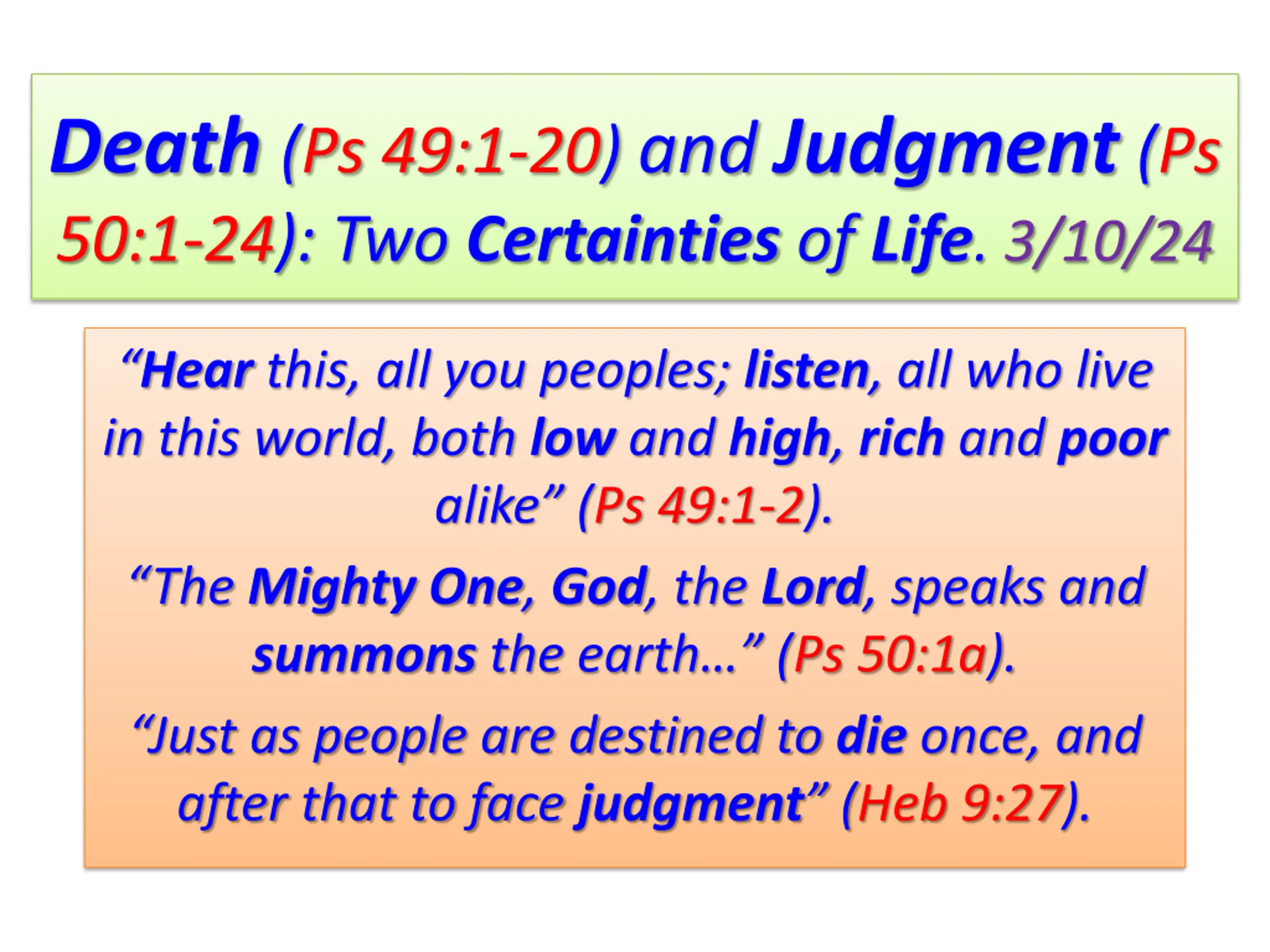 Death(Ps 49:1-20) and Judgment (Ps 50:1-24): Two Certainties of Life. 3/10/24 Hear this, all you peoples; listen, all who live in this world, both low and high, rich and poor alike (Ps 49:1-2). The Mighty One, God, the Lord, speaks and summons the earth (Ps 50:1a). Just as people are destined to die once, and after that to face judgment (Heb 9:27).
