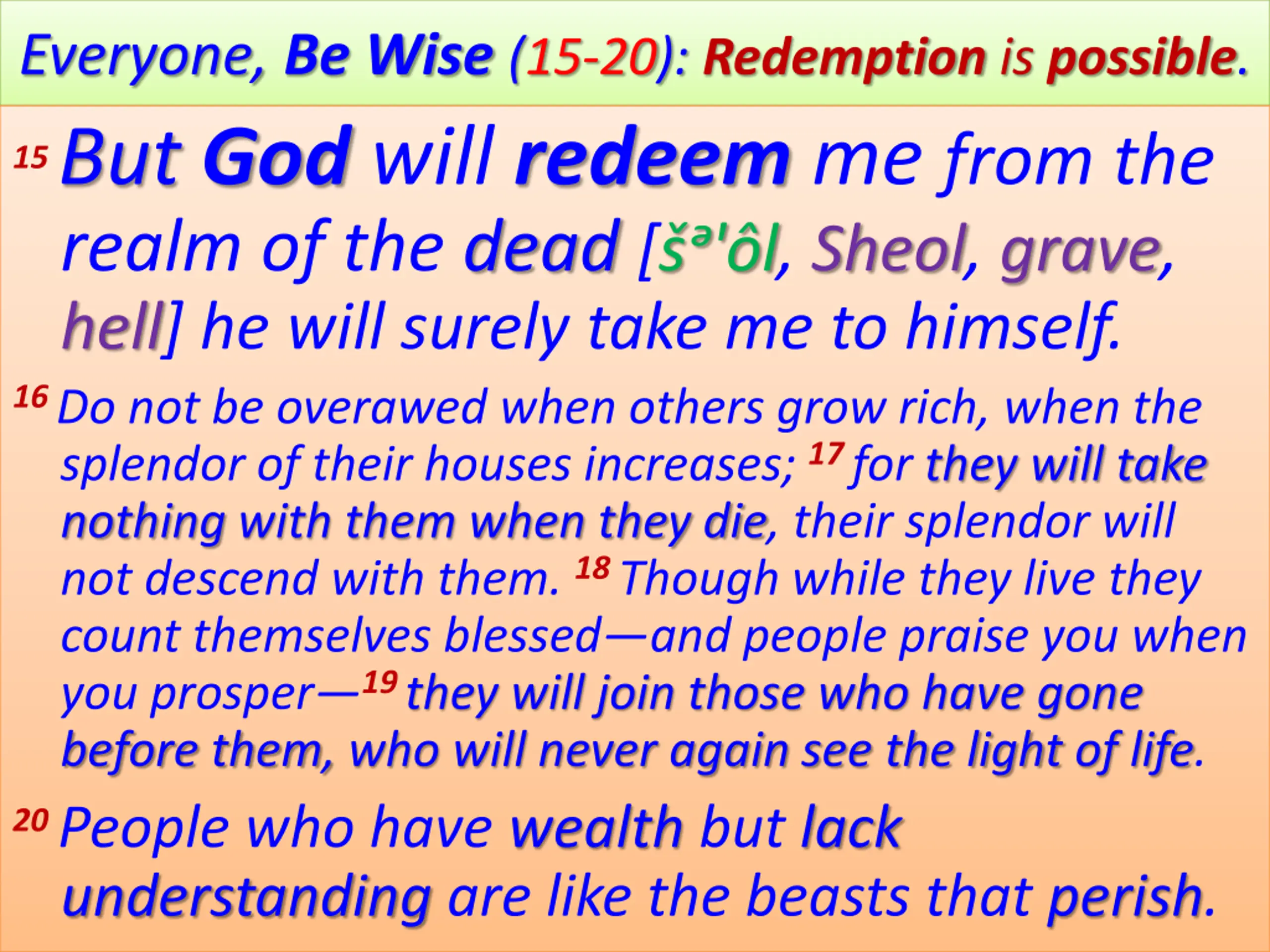 Everyone, Be Wise (15-20): Redemption is possible. 15But God will redeem me from the realm of the dead [ ' l, Sheol, grave, hell] he will surely take me to himself. 16Do not be overawed when others grow rich, when the splendor of their houses increases; 17for they will take nothing with them when they die, their splendor will not descend with them. 18Though while they live they count themselves blessed and people praise you when you prosper 19they will join those who have gone before them, who will never again see the light of life. 20People who have wealth but lack understanding are like the beasts that perish.