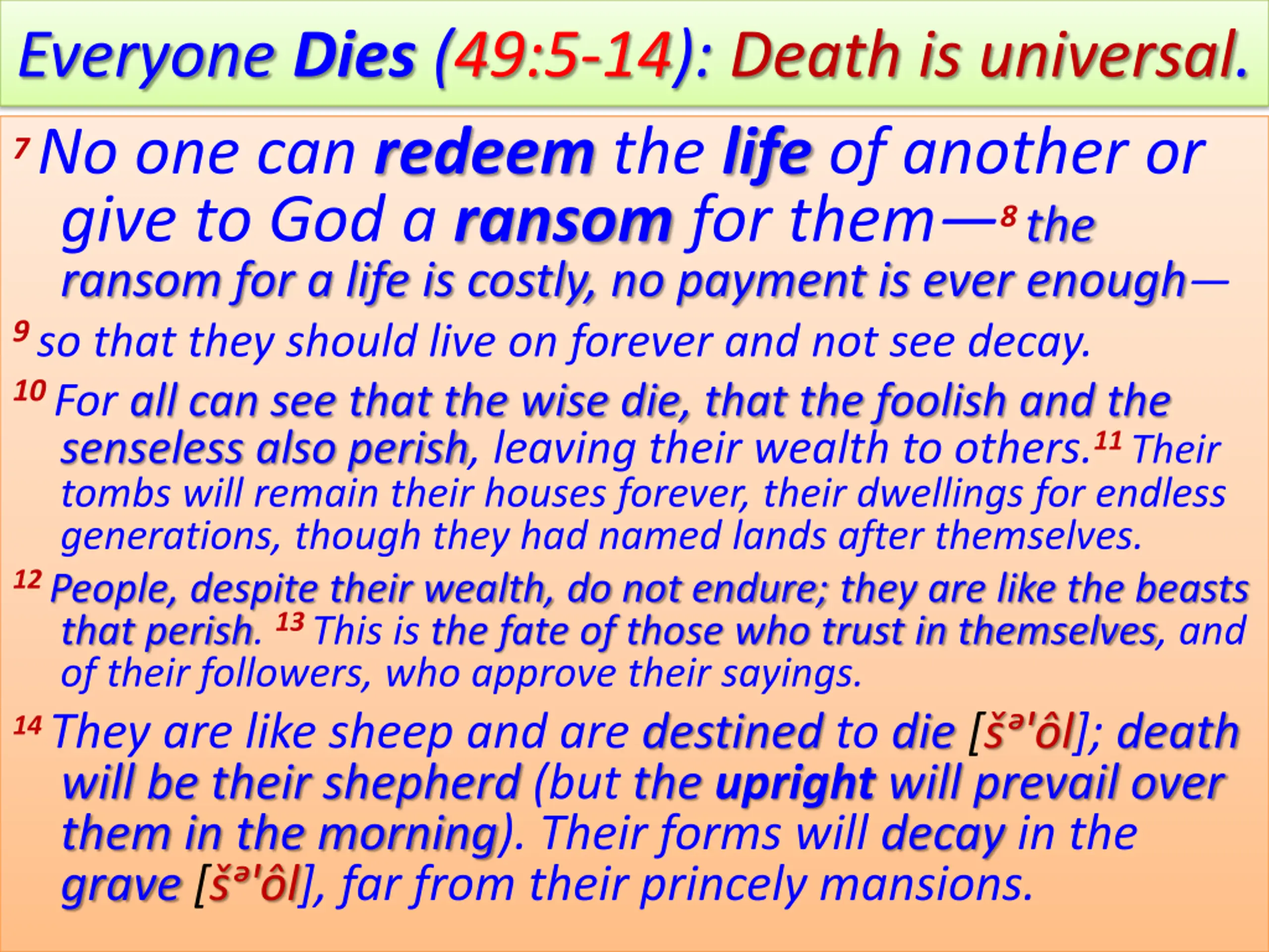 Everyone Dies (49:5-14): Death is universal. 7No one can redeem the life of another or give to God a ransom for them 8the ransom for a life is costly, no payment is ever enough 9so that they should live on forever and not see decay. 10For all can see that the wise die, that the foolish and the senseless also perish, leaving their wealth to others.11Their tombs will remain their houses forever, their dwellings for endless generations, though they had named lands after themselves. 12People, despite their wealth, do not endure; they are like the beasts that perish. 13This is the fate of those who trust in themselves, and of their followers, who approve their sayings. 14They are like sheep and are destined to die [ ' l]; death will be their shepherd (but the upright will prevail over them in the morning). Their forms will decay in the grave [ ' l], far from their princely mansions.