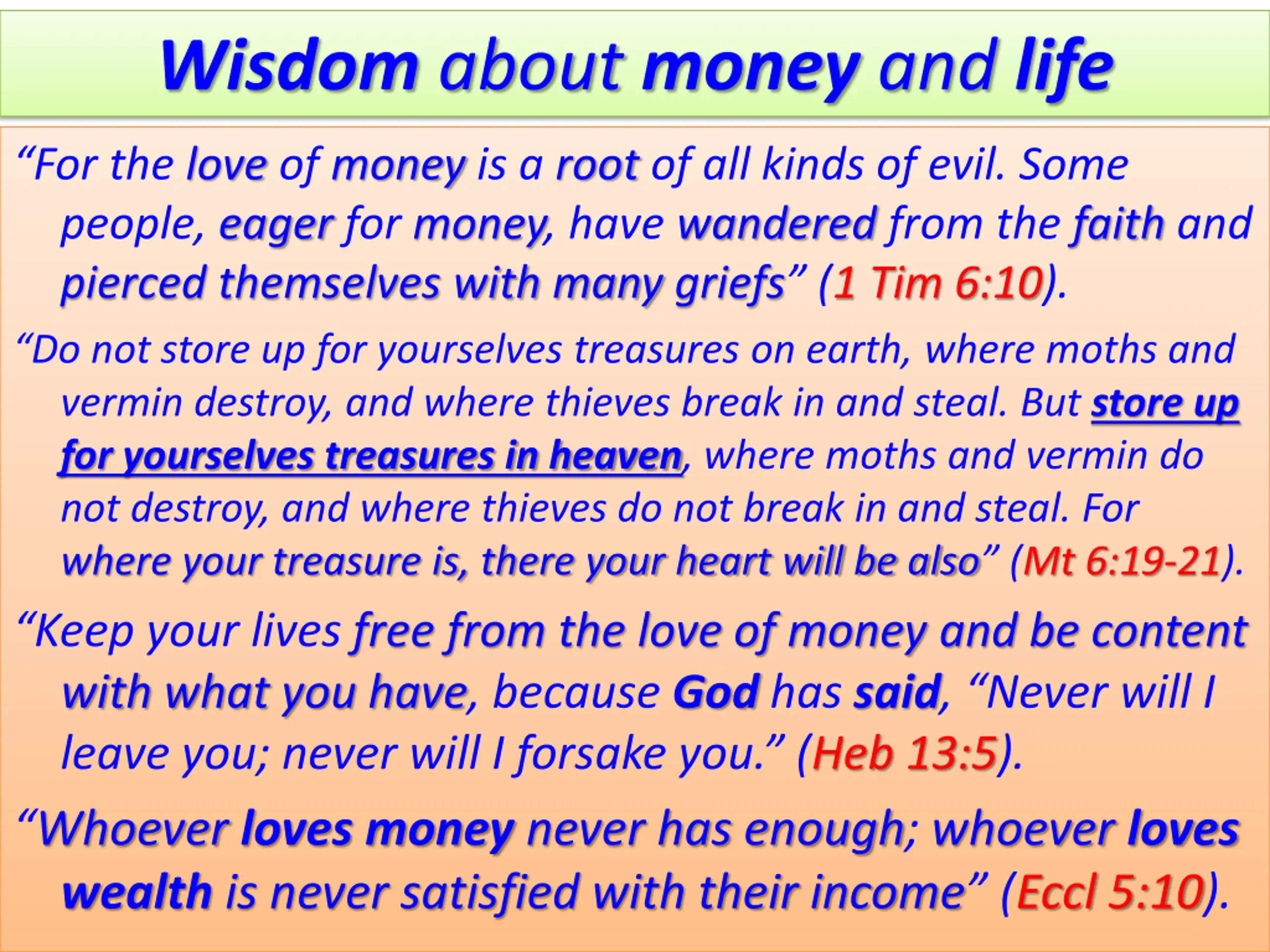 Wisdom about money and life For the love of money is a root of all kinds of evil. Some people, eager for money, have wandered from the faith and pierced themselves with many griefs (1 Tim 6:10). Do not store up for yourselves treasures on earth, where moths and vermin destroy, and where thieves break in and steal. But store up for yourselves treasures in heaven, where moths and vermin do not destroy, and where thieves do not break in and steal. For where your treasure is, there your heart will be also (Mt 6:19-21). Keep your lives free from the love of money and be content with what you have, because God has said, Never will I leave you; never will I forsake you. (Heb 13:5). Whoever loves money never has enough; whoever loves wealth is never satisfied with their income (Eccl 5:10).
