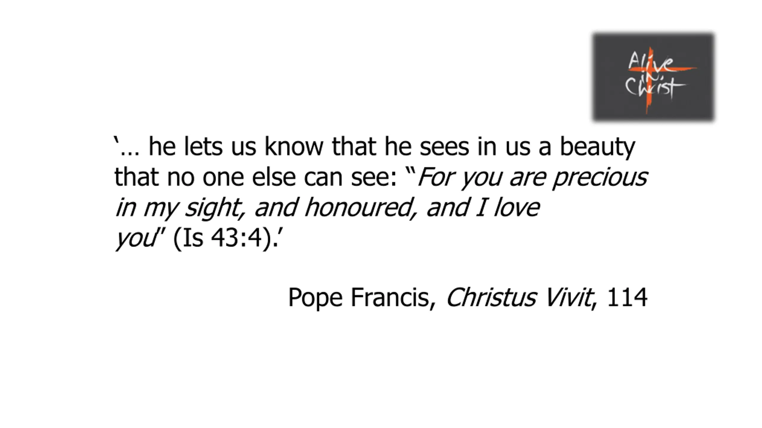 he lets us know that he sees in us a beauty that no one else can see: For you are precious in my sight, and honoured, and I love you (Is 43:4). Pope Francis, Christus Vivit, 114