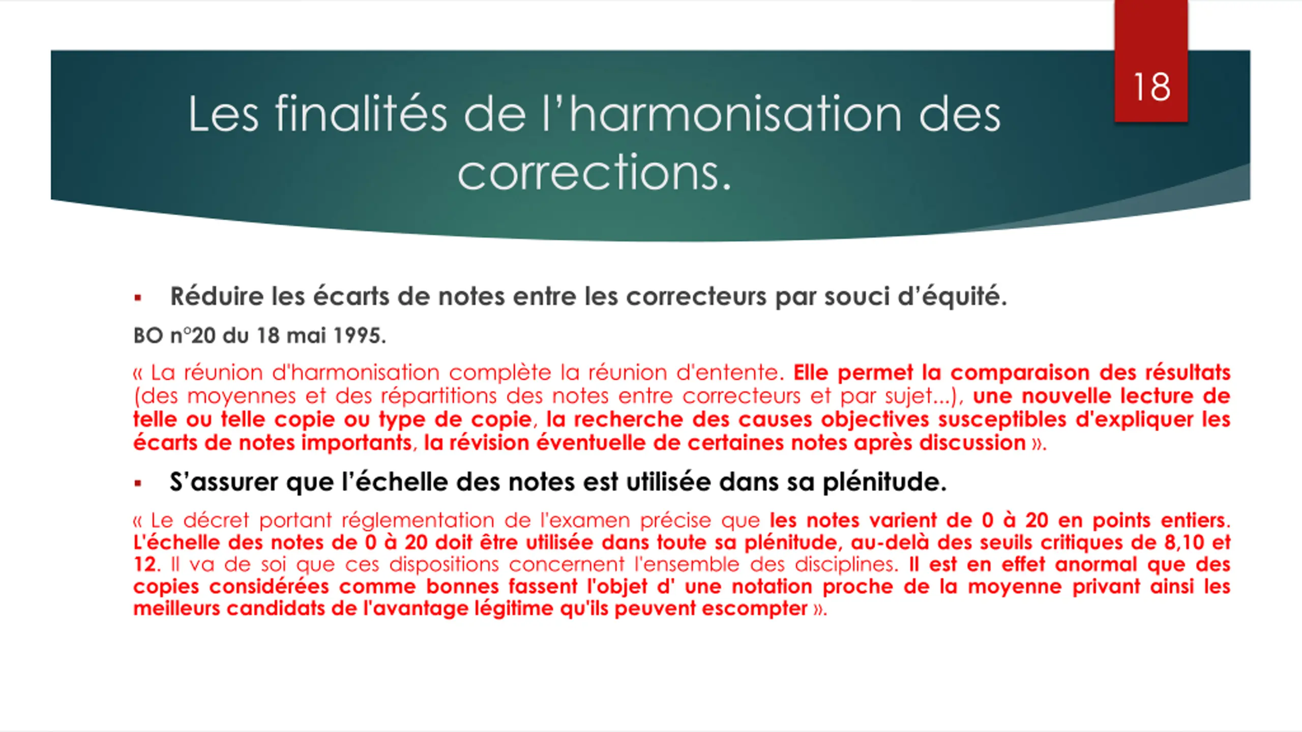 18 Les finalit s de l harmonisation des corrections. R duire les carts de notes entre les correcteurs par souci d quit . BO n 20 du 18 mai 1995. La r union d'harmonisation compl te la r union d'entente. Elle permet la comparaison des r sultats (des moyennes et des r partitions des notes entre correcteurs et par sujet...), une nouvelle lecture de telle ou telle copie ou type de copie, la recherche des causes objectives susceptibles d'expliquer les carts de notes importants, la r vision ventuelle de certaines notes apr s discussion . S assurer que l chelle des notes est utilis e dans sa pl nitude. Le d cret portant r glementation de l'examen pr cise que les notes varient de 0 20 en points entiers. L' chelle des notes de 0 20 doit tre utilis e dans toute sa pl nitude, au-del des seuils critiques de 8,10 et 12. Il va de soi que ces dispositions concernent l'ensemble des disciplines. Il est en effet anormal que des copies consid r es comme bonnes fassent l'objet d' une notation proche de la moyenne privant ainsi les meilleurs candidats de l'avantage l gitime qu'ils peuvent escompter .