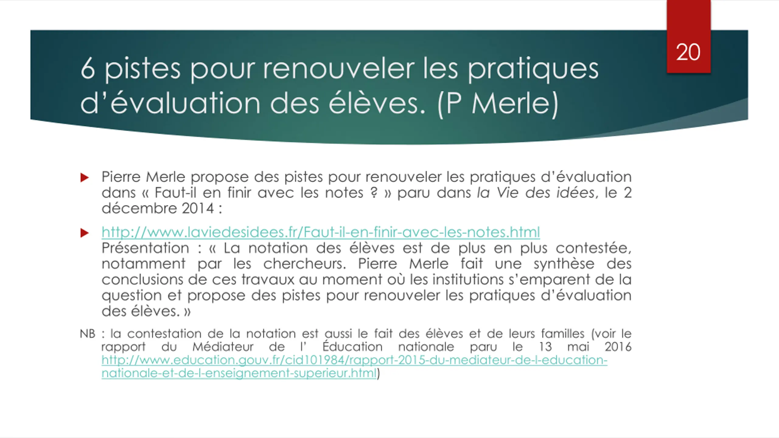 20 6 pistes pour renouveler les pratiques d valuation des l ves. (P Merle) Pierre Merle propose des pistes pour renouveler les pratiques d valuation dans Faut-il en finir avec les notes ? paru dans la Vie des id es, le 2 d cembre 2014 : http://www.laviedesidees.fr/Faut-il-en-finir-avec-les-notes.html Pr sentation : La notation des l ves est de plus en plus contest e, notamment par les chercheurs. Pierre Merle fait une synth se des conclusions de ces travaux au moment o les institutions s emparent de la question et propose des pistes pour renouveler les pratiques d valuation des l ves. NB : la contestation de la notation est aussi le fait des l ves et de leurs familles (voir le rapport du M diateur de l ducation http://www.education.gouv.fr/cid101984/rapport-2015-du-mediateur-de-l-education- nationale-et-de-l-enseignement-superieur.html) nationale paru le 13 mai 2016