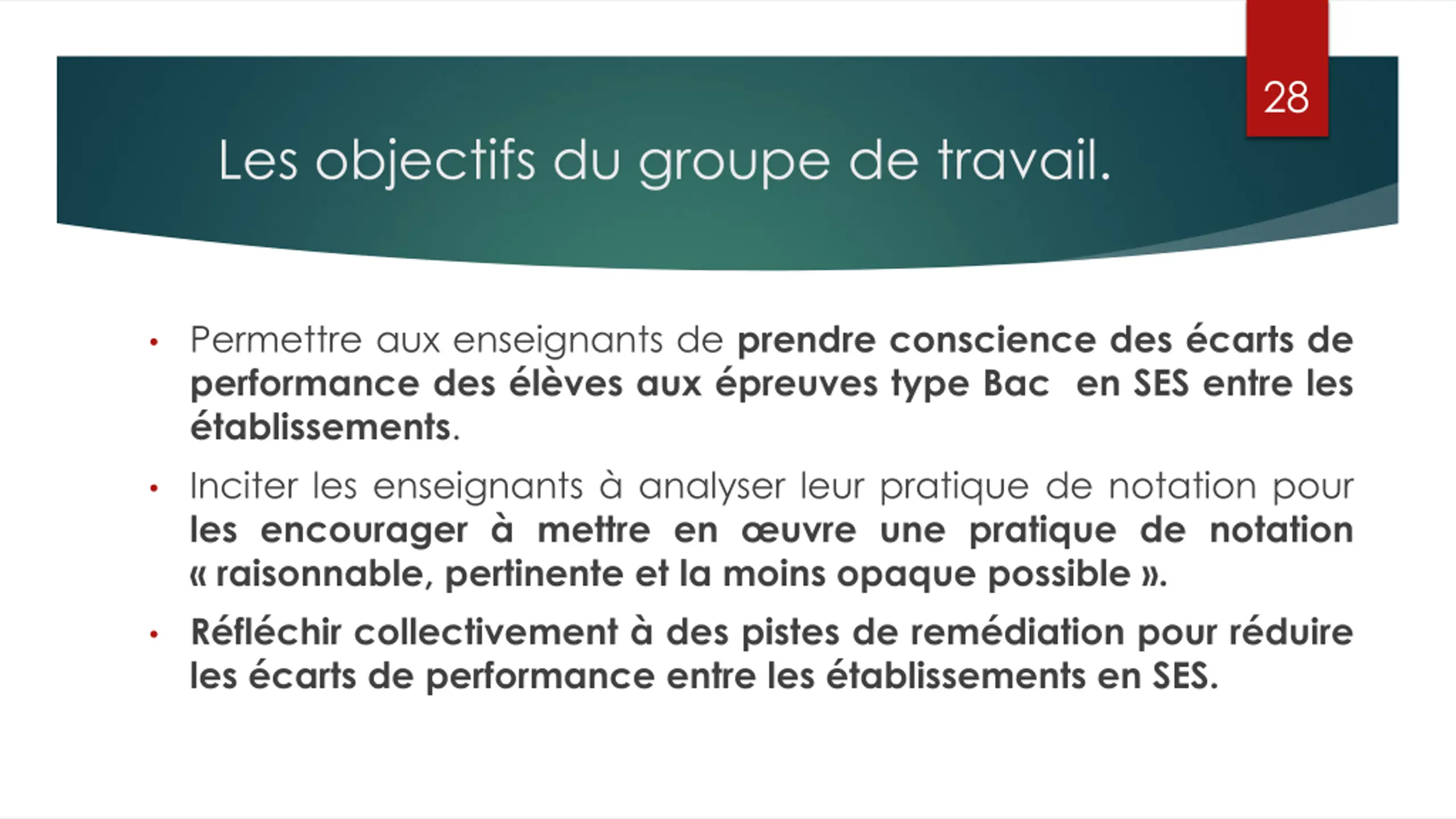 28 Les objectifs du groupe de travail. Permettre aux enseignants de prendre conscience des carts de performance des l ves aux preuves type Bac en SES entre les tablissements. Inciter les enseignants analyser leur pratique de notation pour les encourager mettre en uvre une pratique de notation raisonnable, pertinente et la moins opaque possible . R fl chir collectivement des pistes de rem diation pour r duire les carts de performance entre les tablissements en SES.