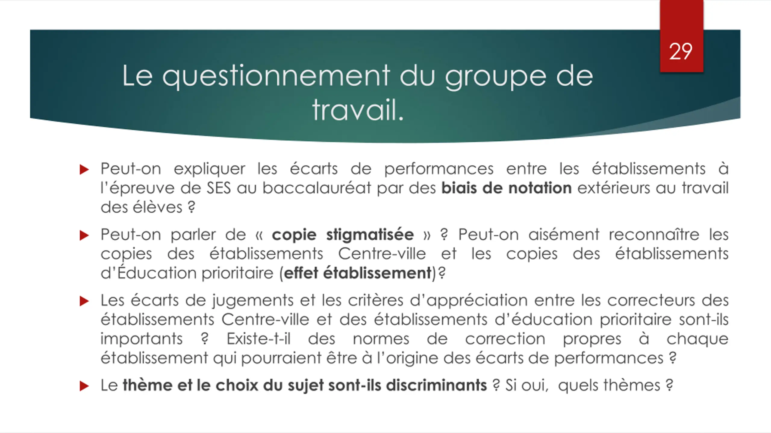 29 Le questionnement du groupe de travail. Peut-on expliquer les carts de performances entre les tablissements l preuve de SES au baccalaur at par des biais de notation ext rieurs au travail des l ves ? Peut-on parler de copie stigmatis e ? Peut-on ais ment reconna tre les copies des tablissements Centre-ville et les copies des tablissements d ducation prioritaire (effet tablissement)? Les carts de jugements et les crit res d appr ciation entre les correcteurs des tablissements Centre-ville et des tablissements d ducation prioritaire sont-ils importants ? Existe-t-il des normes de correction propres chaque tablissement qui pourraient tre l origine des carts de performances ? Le th me et le choix du sujet sont-ils discriminants ? Si oui, quels th mes ?