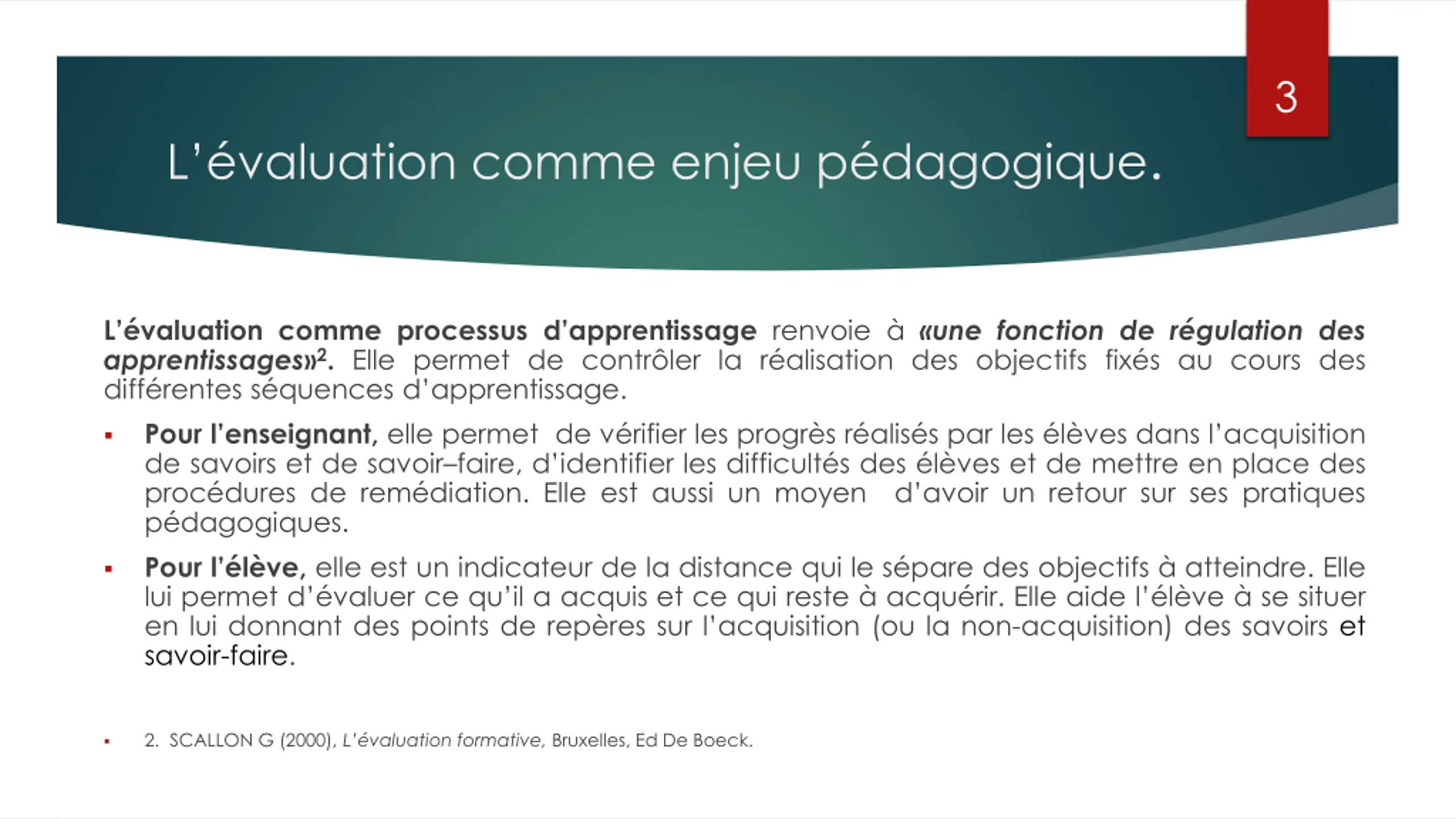 3 L valuation comme enjeu p dagogique. L valuation comme processus d apprentissage renvoie une fonction de r gulation des apprentissages 2. Elle permet de contr ler la r alisation des objectifs fix s au cours des diff rentes s quences d apprentissage. Pour l enseignant, elle permet de v rifier les progr s r alis s par les l ves dans l acquisition de savoirs et de savoir faire, d identifier les difficult s des l ves et de mettre en place des proc dures de rem diation. Elle est aussi un moyen d avoir un retour sur ses pratiques p dagogiques. Pour l l ve,elle est un indicateur de la distance qui le s pare des objectifs atteindre. Elle lui permet d valuer ce qu il a acquis et ce qui reste acqu rir. Elle aide l l ve se situer en lui donnant des points de rep res sur l acquisition (ou la non-acquisition) des savoirs et savoir-faire. 2. SCALLON G (2000), L valuation formative, Bruxelles, Ed De Boeck.
