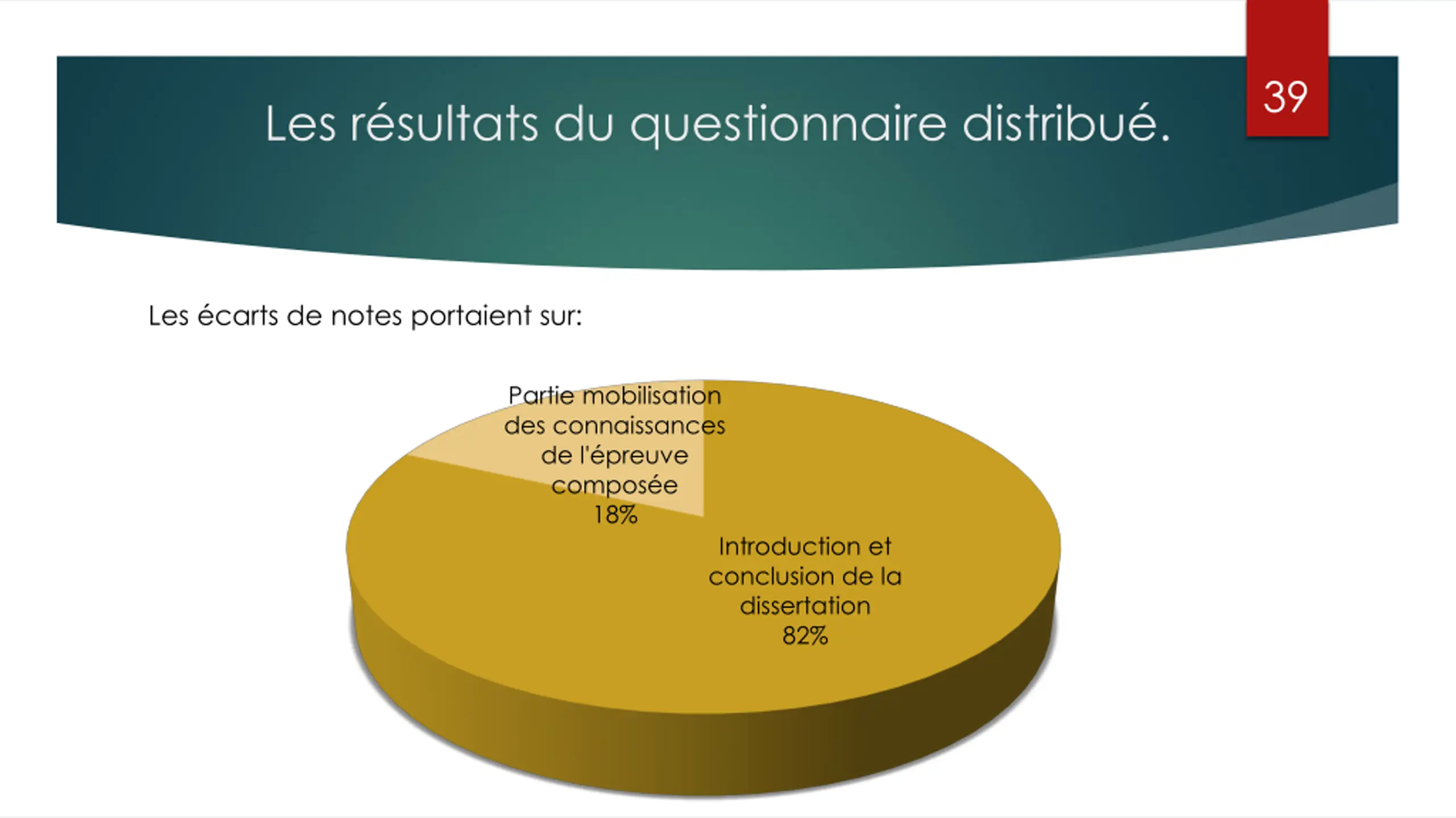39 Les r sultats du questionnaire distribu . Les carts de notes portaient sur: Partie mobilisation des connaissances de l' preuve compos e 18% Introduction et conclusion de la dissertation 82%