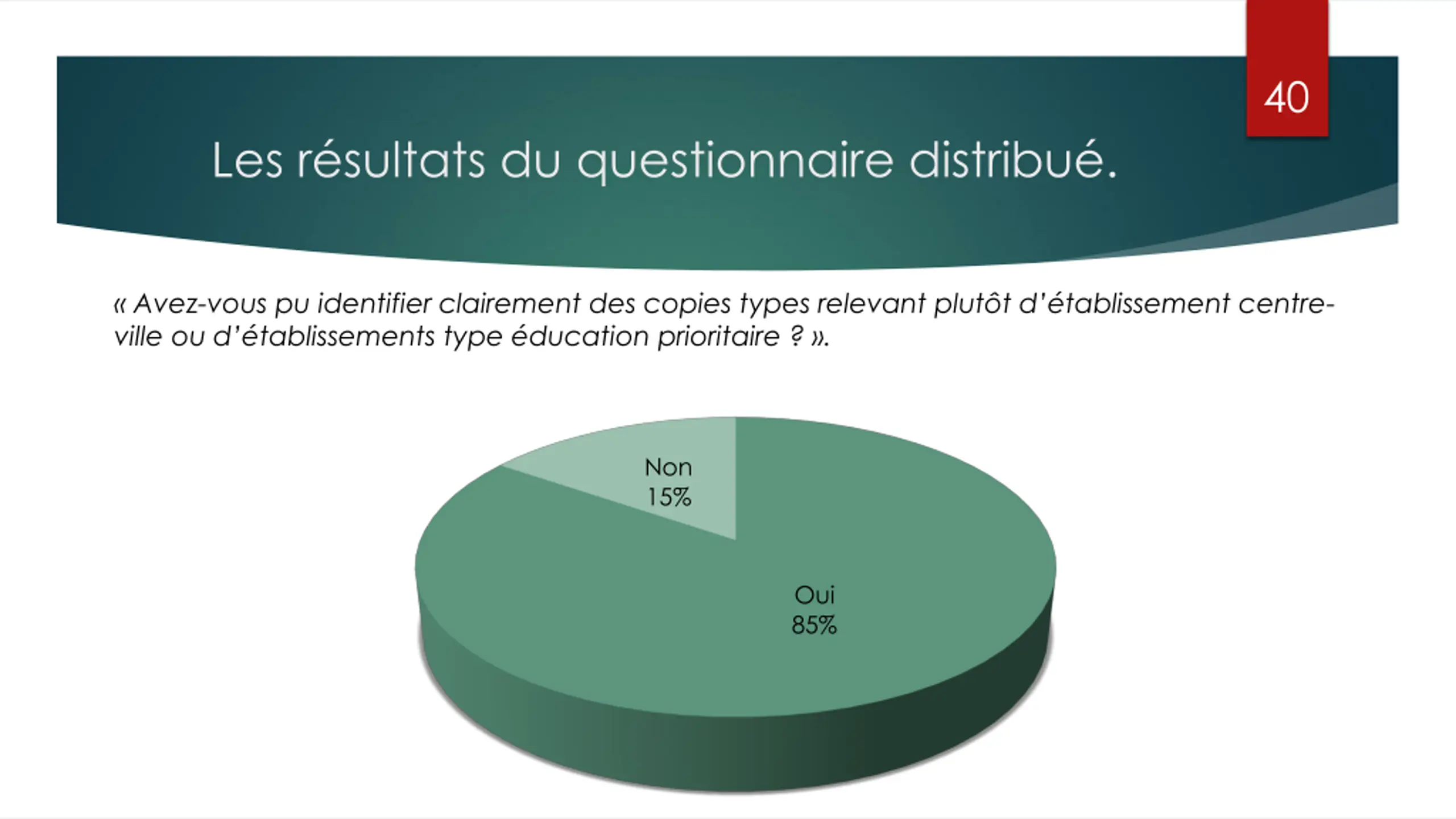 40 Les r sultats du questionnaire distribu . Avez-vous pu identifier clairement des copies types relevant plut t d tablissement centre- ville ou d tablissements type ducation prioritaire ? . Non 15% Oui 85%
