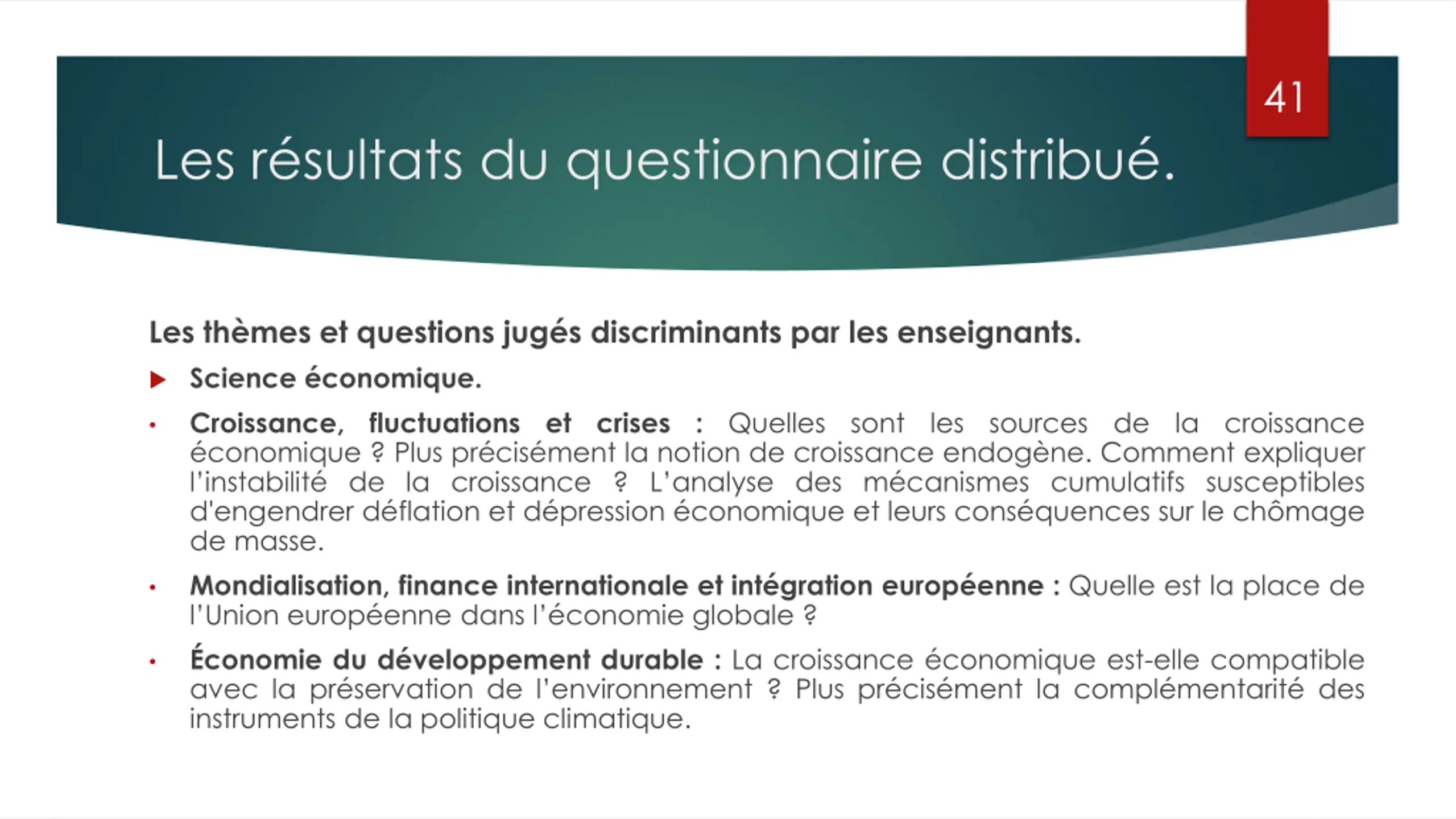 41 Les r sultats du questionnaire distribu . Les th mes et questions jug s discriminants par les enseignants. Science conomique. Croissance, fluctuations et crises conomique ? Plus pr cis ment la notion de croissance endog ne. Comment expliquer l instabilit de la croissance ?L analyse des m canismes cumulatifs susceptibles d'engendrer d flation et d pression conomique et leurs cons quences sur le ch mage de masse. Mondialisation, finance internationale et int gration europ enne : Quelle est la place de l Union europ enne dans l conomie globale ? conomie du d veloppement durable : La croissance conomique est-elle compatible avec la pr servation de l environnement ? Plus pr cis ment la compl mentarit des instruments de la politique climatique. : Quelles sont les sources de la croissance
