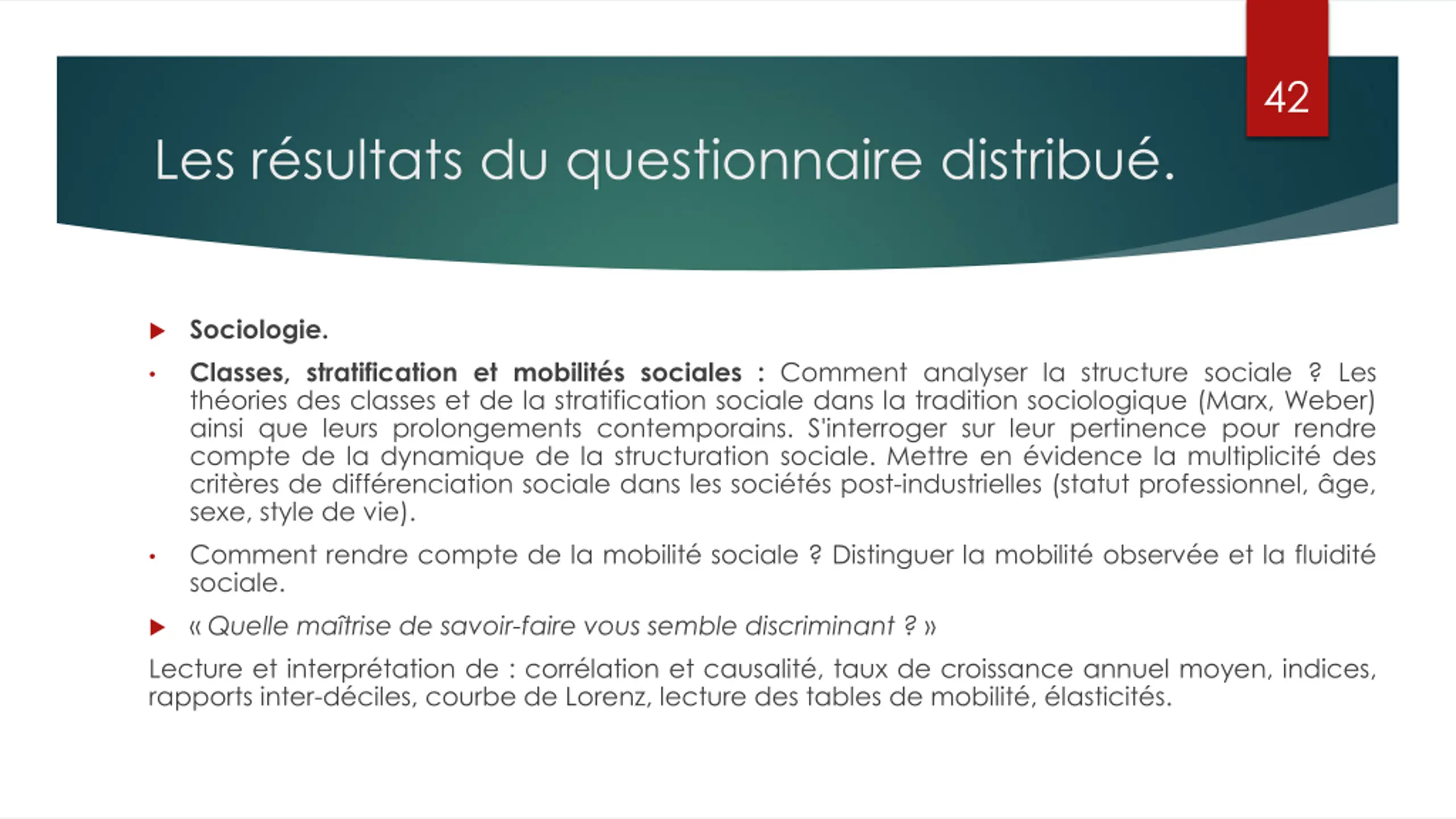 42 Les r sultats du questionnaire distribu . Sociologie. Classes, stratification et mobilit s sociales : Comment analyser la structure sociale ?Les th ories des classes et de la stratification sociale dans la tradition sociologique (Marx, Weber) ainsi que leurs prolongements contemporains. S'interroger sur leur pertinence pour rendre compte de la dynamique de la structuration sociale. Mettre en vidence la multiplicit des crit res de diff renciation sociale dans les soci t s post-industrielles (statut professionnel, ge, sexe, style de vie). Comment rendre compte de la mobilit sociale ? Distinguer la mobilit observ e et la fluidit sociale. Quelle ma trise de savoir-faire vous semble discriminant ? Lecture et interpr tation de : corr lation et causalit , taux de croissance annuel moyen, indices, rapports inter-d ciles, courbe de Lorenz, lecture des tables de mobilit , lasticit s.