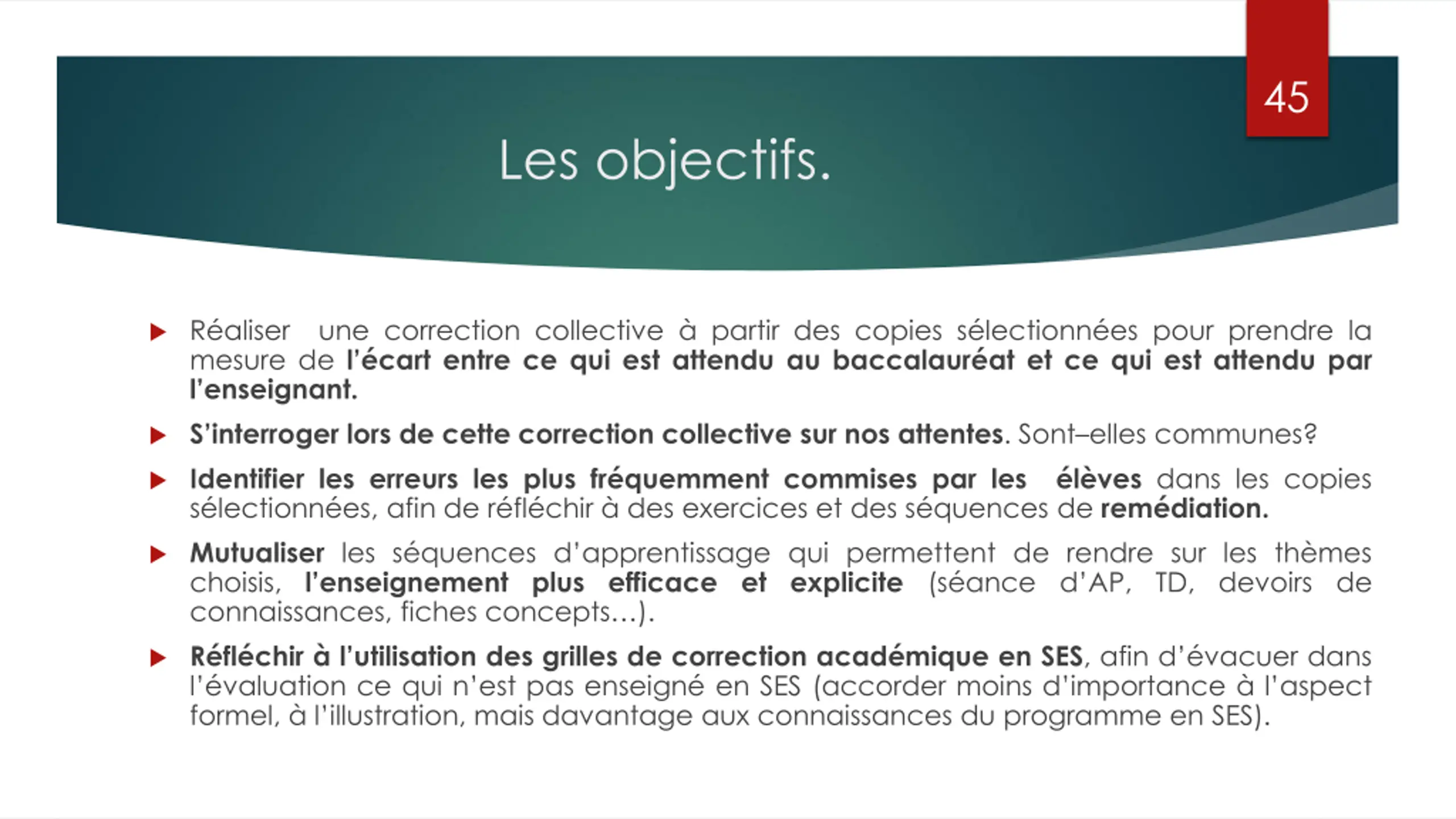 45 Les objectifs. R aliser une correction collective partir des copies s lectionn es pour prendre la mesure de l cart entre ce qui est attendu au baccalaur at et ce qui est attendu par l enseignant. S interroger lors de cette correction collective sur nos attentes. Sont elles communes? Identifierles erreurs les plus fr quemment commises par les l ves dans les copies s lectionn es, afin de r fl chir des exercices et des s quences de rem diation. Mutualiser les s quences d apprentissage qui permettent de rendre sur les th mes choisis, l enseignement plus efficace et explicite (s ance d AP, TD, devoirs de connaissances, fiches concepts ). R fl chir l utilisation des grilles de correction acad mique en SES, afin d vacuer dans l valuation ce qui n est pas enseign en SES (accorder moins d importance l aspect formel, l illustration, mais davantage aux connaissances du programme en SES).