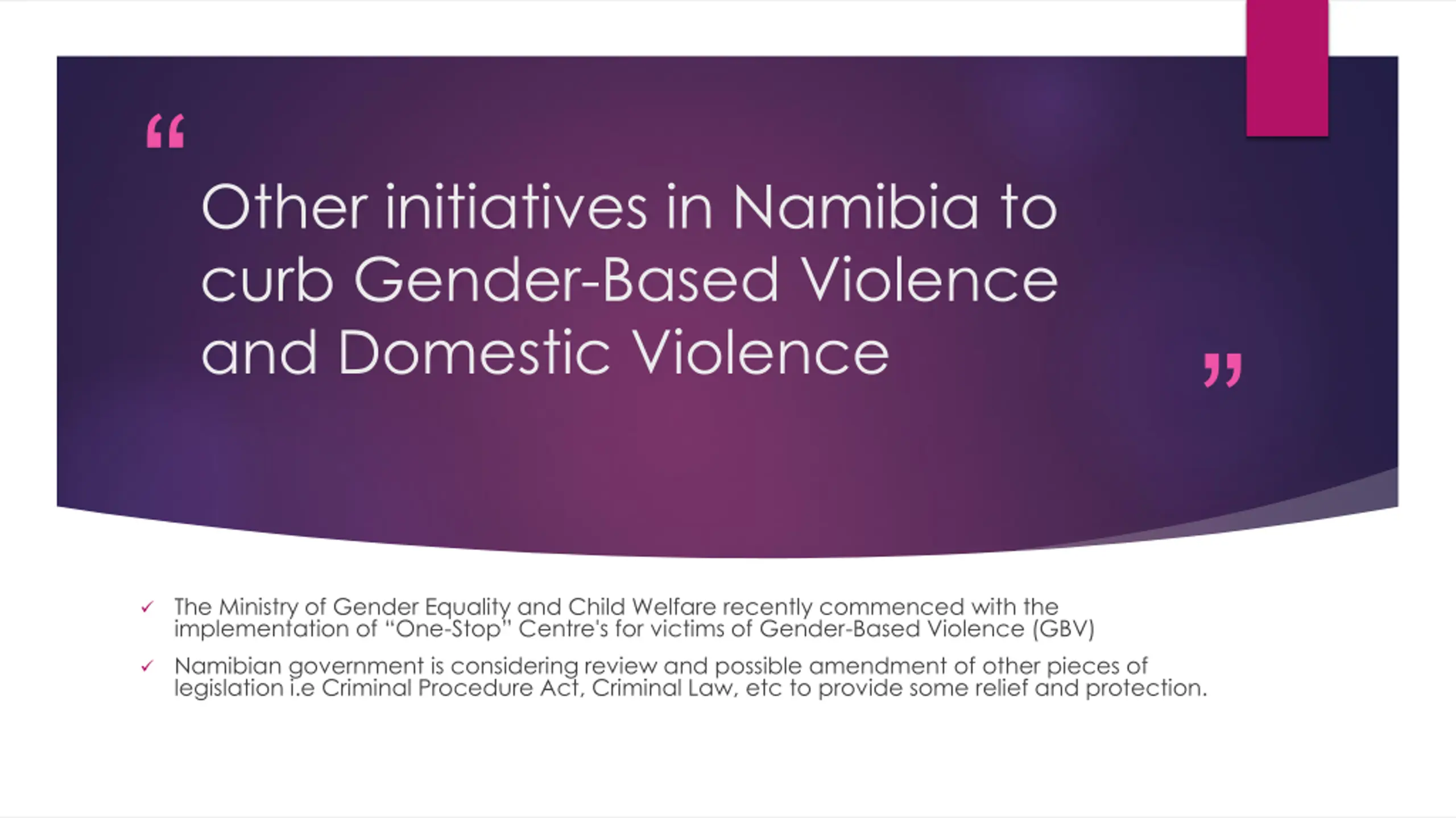 Other initiatives in Namibia to curb Gender-Based Violence and Domestic Violence The Ministry of Gender Equality and Child Welfare recently commenced with the implementation of One-Stop Centre's for victims of Gender-Based Violence (GBV) Namibian government is considering review and possible amendment of other pieces of legislation i.e Criminal Procedure Act, Criminal Law, etc to provide some relief and protection.