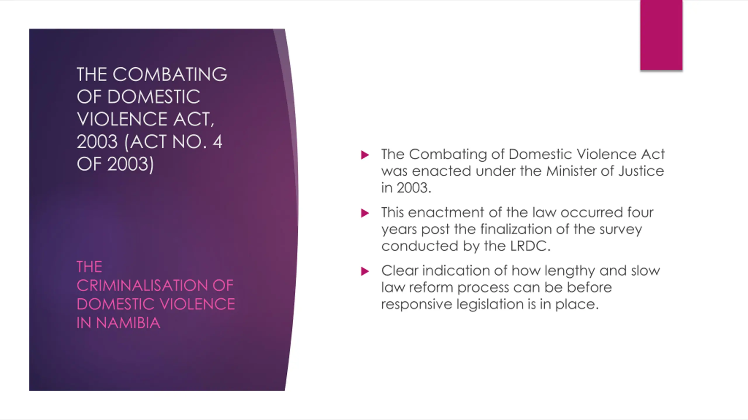 THE COMBATING OF DOMESTIC VIOLENCE ACT, 2003 (ACT NO. 4 OF 2003) The Combating of Domestic Violence Act was enacted under the Minister of Justice in 2003. This enactment of the law occurred four years post the finalization of the survey conducted by the LRDC. THE CRIMINALISATION OF DOMESTIC VIOLENCE IN NAMIBIA Clear indication of how lengthy and slow law reform process can be before responsive legislation is in place.