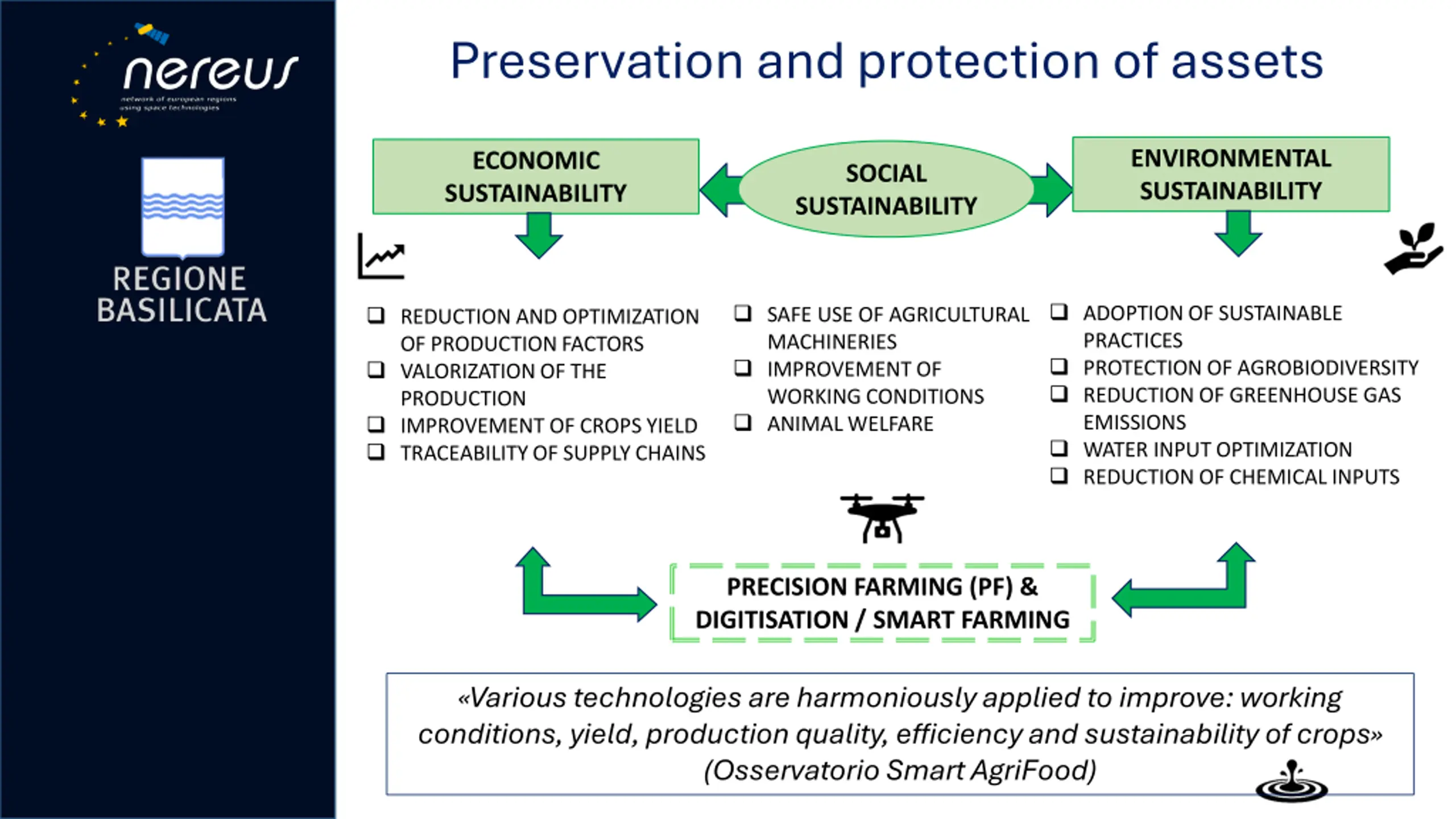 Preservation and protection of assets ENVIRONMENTAL SUSTAINABILITY ECONOMIC SUSTAINABILITY SOCIAL SUSTAINABILITY ADOPTION OF SUSTAINABLE PRACTICES PROTECTION OF AGROBIODIVERSITY REDUCTION OF GREENHOUSE GAS EMISSIONS WATER INPUT OPTIMIZATION REDUCTION OF CHEMICAL INPUTS SAFE USE OF AGRICULTURAL MACHINERIES IMPROVEMENT OF WORKING CONDITIONS ANIMAL WELFARE REDUCTION AND OPTIMIZATION OF PRODUCTION FACTORS VALORIZATION OF THE PRODUCTION IMPROVEMENT OF CROPS YIELD TRACEABILITY OF SUPPLY CHAINS PRECISION FARMING (PF) & DIGITISATION / SMART FARMING Various technologies are harmoniously applied to improve: working conditions, yield, production quality, efficiency and sustainability of crops (Osservatorio Smart AgriFood)