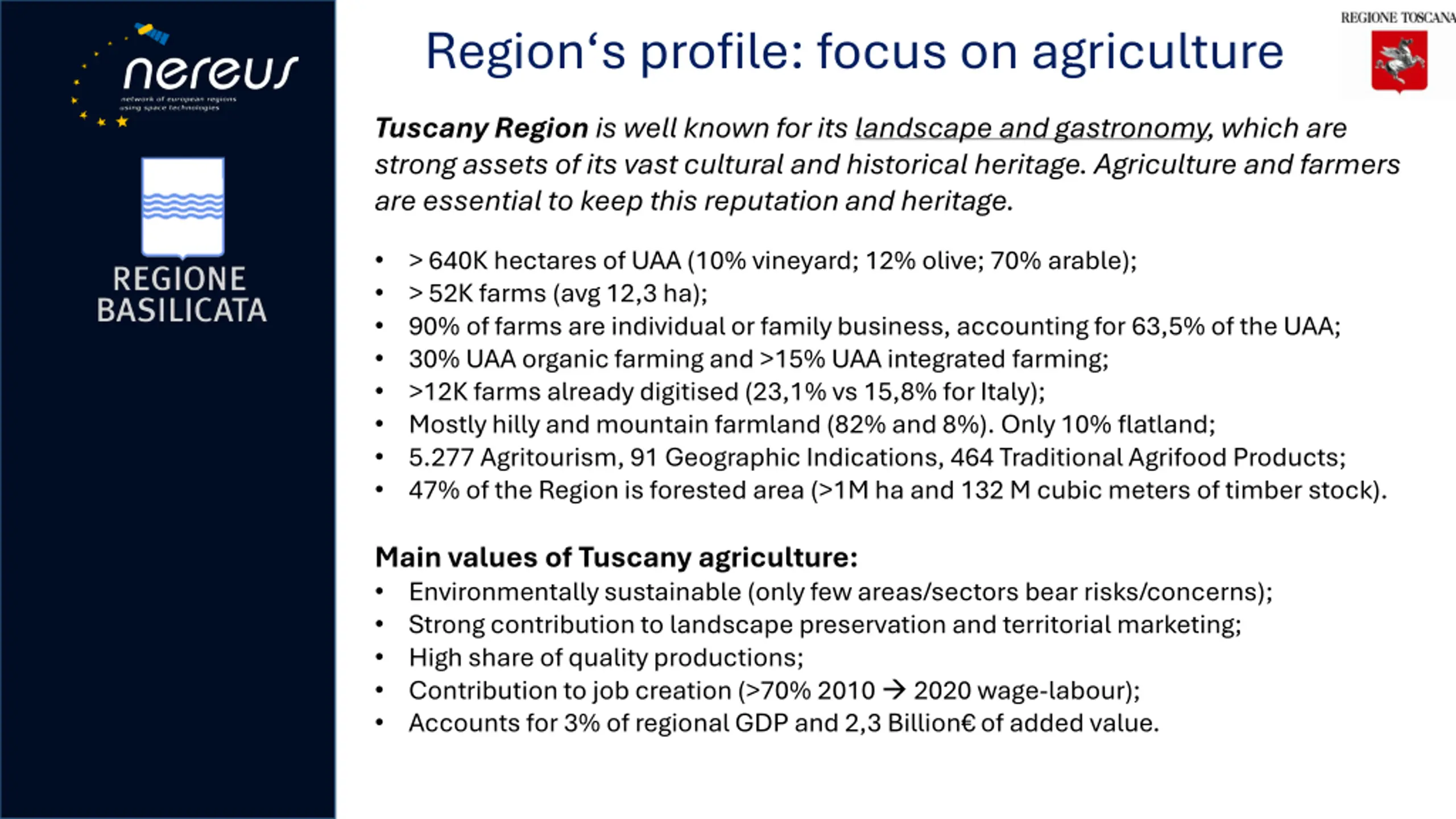 Regions profile: focus on agriculture Tuscany Region is well known for its landscape and gastronomy, which are strong assets of its vast cultural and historical heritage. Agriculture and farmers are essential to keep this reputation and heritage. > 640K hectares of UAA (10% vineyard; 12% olive; 70% arable); > 52K farms (avg12,3 ha); 90% of farms are individualor family business, accountingfor 63,5% of the UAA; 30% UAA organicfarmingand >15% UAA integrated farming; >12K farms already digitised (23,1% vs 15,8% for Italy); Mostlyhillyand mountain farmland (82% and 8%). Only10% flatland; 5.277 Agritourism, 91 GeographicIndications, 464 TraditionalAgrifoodProducts; 47% of the Regionis forested area (>1M ha and 132 M cubicmeters of timber stock). Main values of Tuscany agriculture: Environmentally sustainable (only few areas/sectors bear risks/concerns); Strong contribution to landscape preservation and territorial marketing; High share of quality productions; Contribution to job creation (>70% 2010 2020 wage-labour); Accounts for 3% of regional GDP and 2,3 Billion of added value.