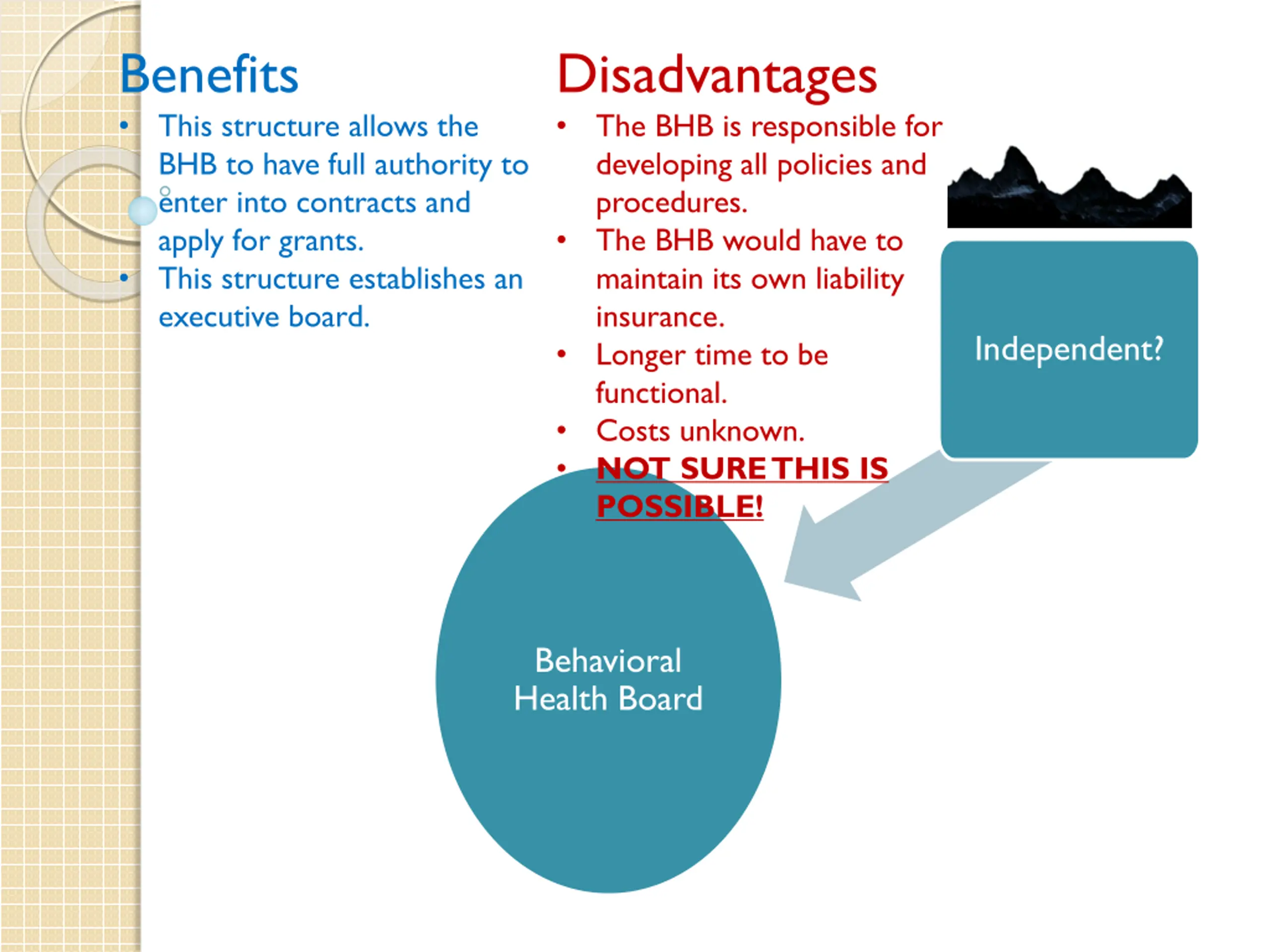 Benefits This structure allows the BHB to have full authority to enter into contracts and apply for grants. This structure establishes an executive board. Disadvantages The BHB is responsible for developing all policies and procedures. The BHB would have to maintain its own liability insurance. Longer time to be functional. Costs unknown. NOT SURE THIS IS POSSIBLE! Independent? Behavioral Health Board