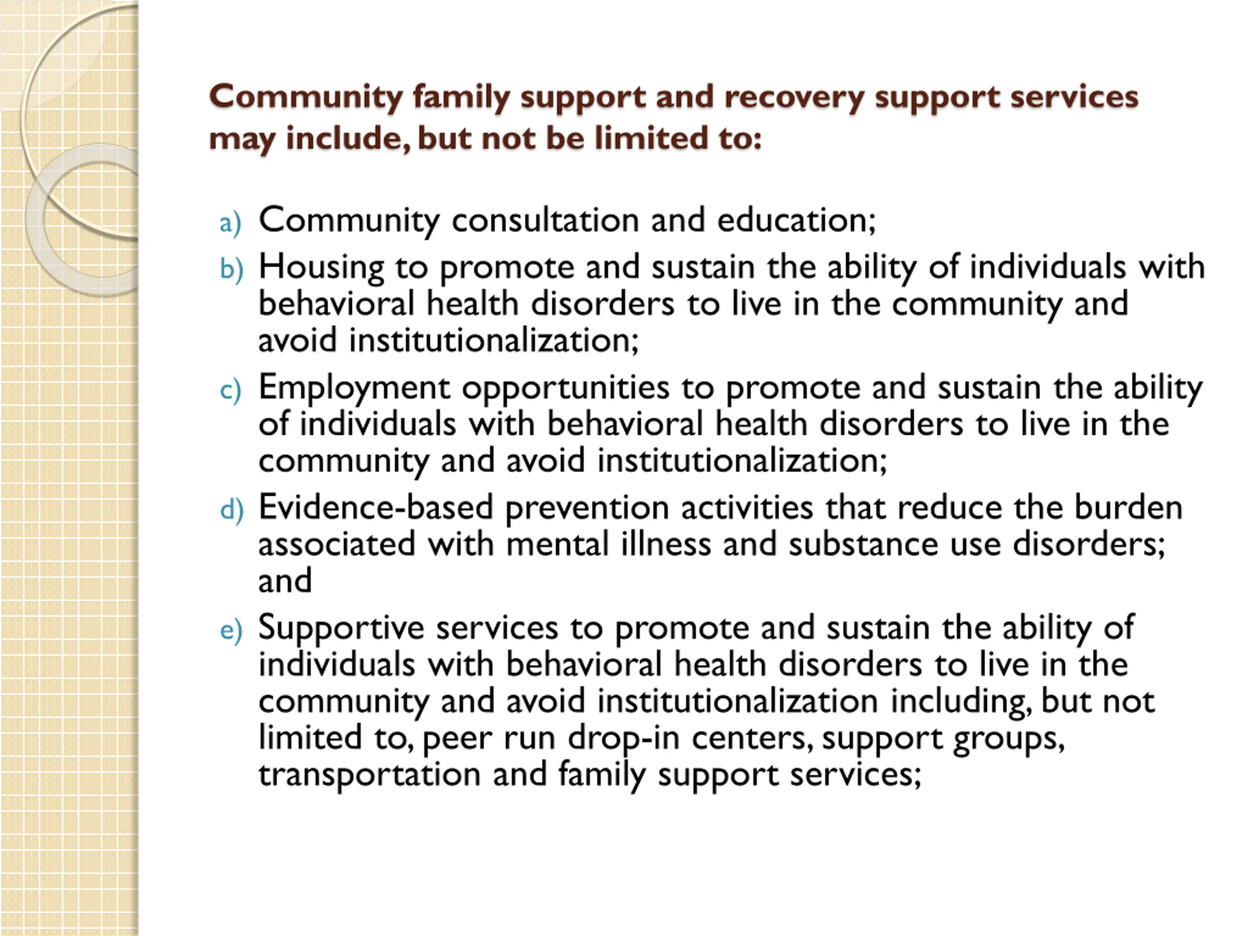 Community family support and recovery support services may include, but not be limited to: a) Community consultation and education; b) Housing to promote and sustain the ability of individuals with behavioral health disorders to live in the community and avoid institutionalization; c) Employment opportunities to promote and sustain the ability of individuals with behavioral health disorders to live in the community and avoid institutionalization; d) Evidence-based prevention activities that reduce the burden associated with mental illness and substance use disorders; and e) Supportive services to promote and sustain the ability of individuals with behavioral health disorders to live in the community and avoid institutionalization including, but not limited to, peer run drop-in centers, support groups, transportation and family support services;