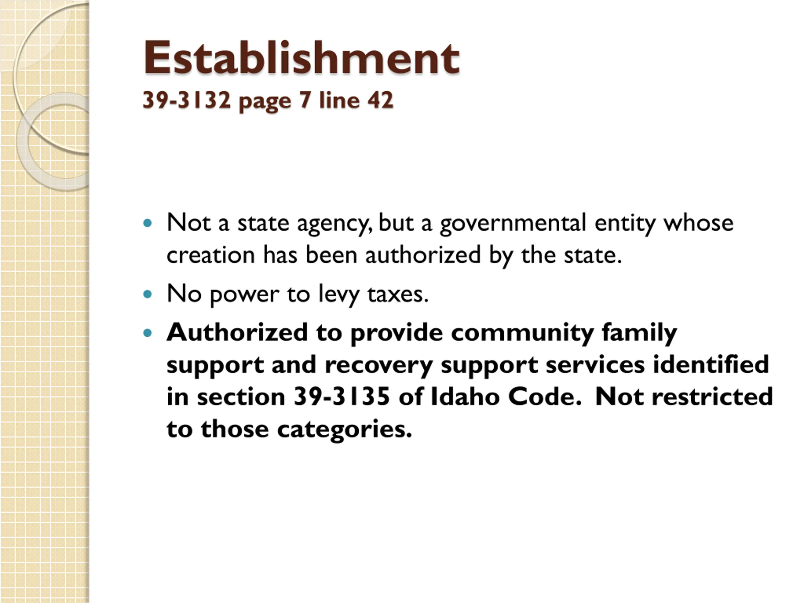 Establishment 39-3132 page 7 line 42 Not a state agency, but a governmental entity whose creation has been authorized by the state. No power to levy taxes. Authorized to provide community family support and recovery support services identified in section 39-3135 of Idaho Code. Not restricted to those categories.