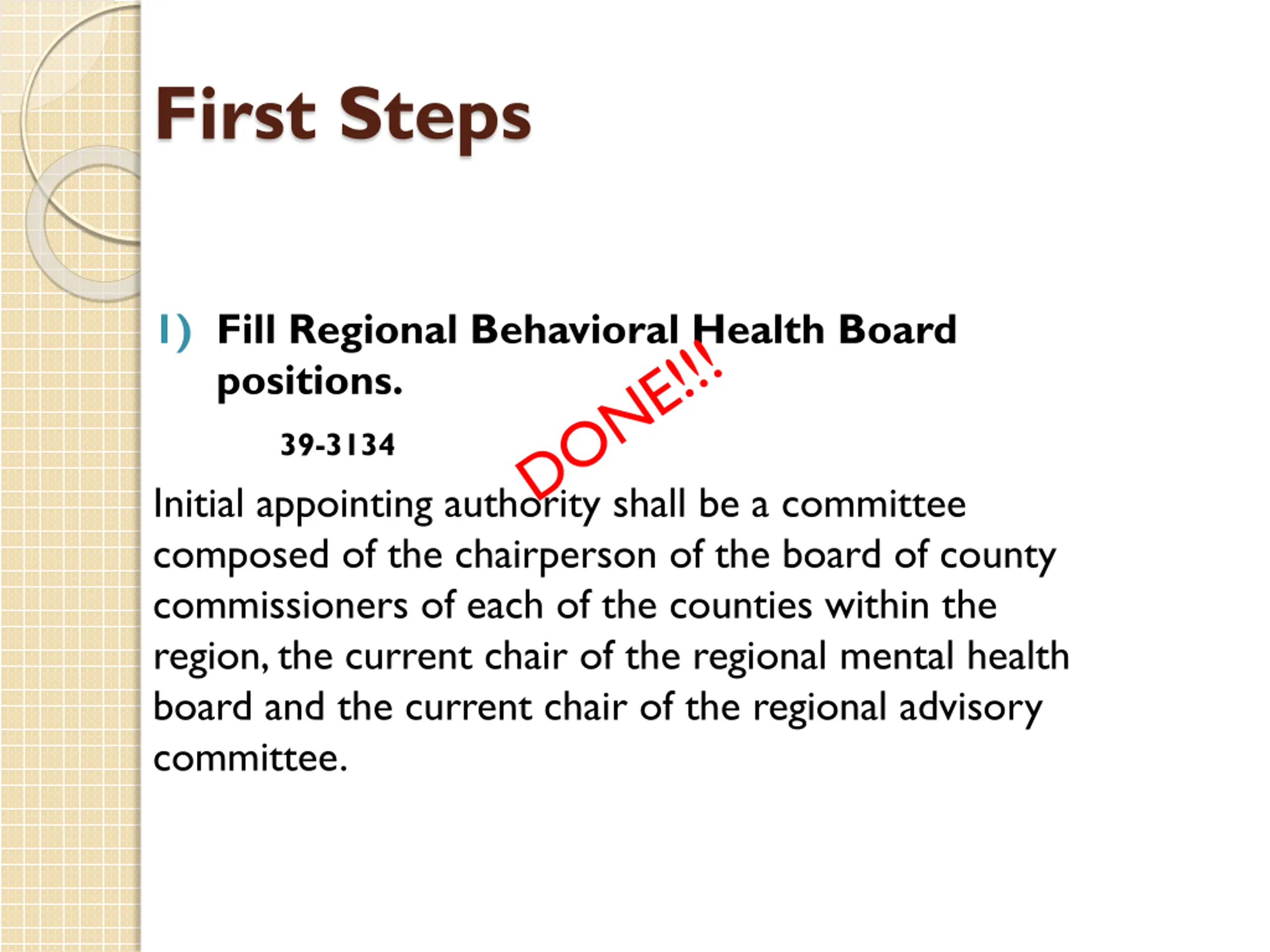 First Steps 1) Fill Regional Behavioral Health Board positions. 39-3134 Initial appointing authority shall be a committee composed of the chairperson of the board of county commissioners of each of the counties within the region, the current chair of the regional mental health board and the current chair of the regional advisory committee.