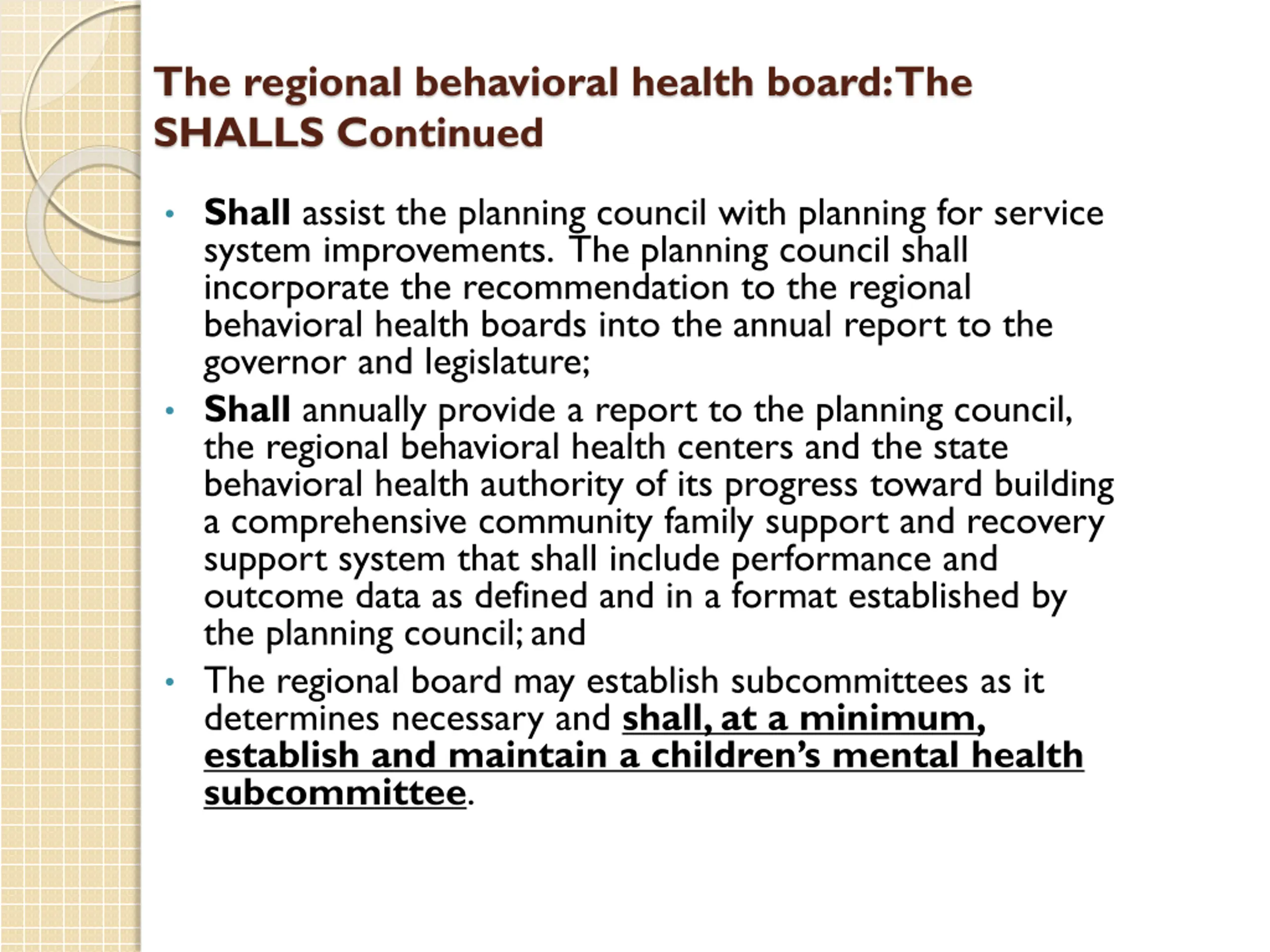 The regional behavioral health board: The SHALLS Continued Shall assist the planning council with planning for service system improvements. The planning council shall incorporate the recommendation to the regional behavioral health boards into the annual report to the governor and legislature; Shall annually provide a report to the planning council, the regional behavioral health centers and the state behavioral health authority of its progress toward building a comprehensive community family support and recovery support system that shall include performance and outcome data as defined and in a format established by the planning council; and The regional board may establish subcommittees as it determines necessary and shall, at a minimum, establish and maintain a children s mental health subcommittee.
