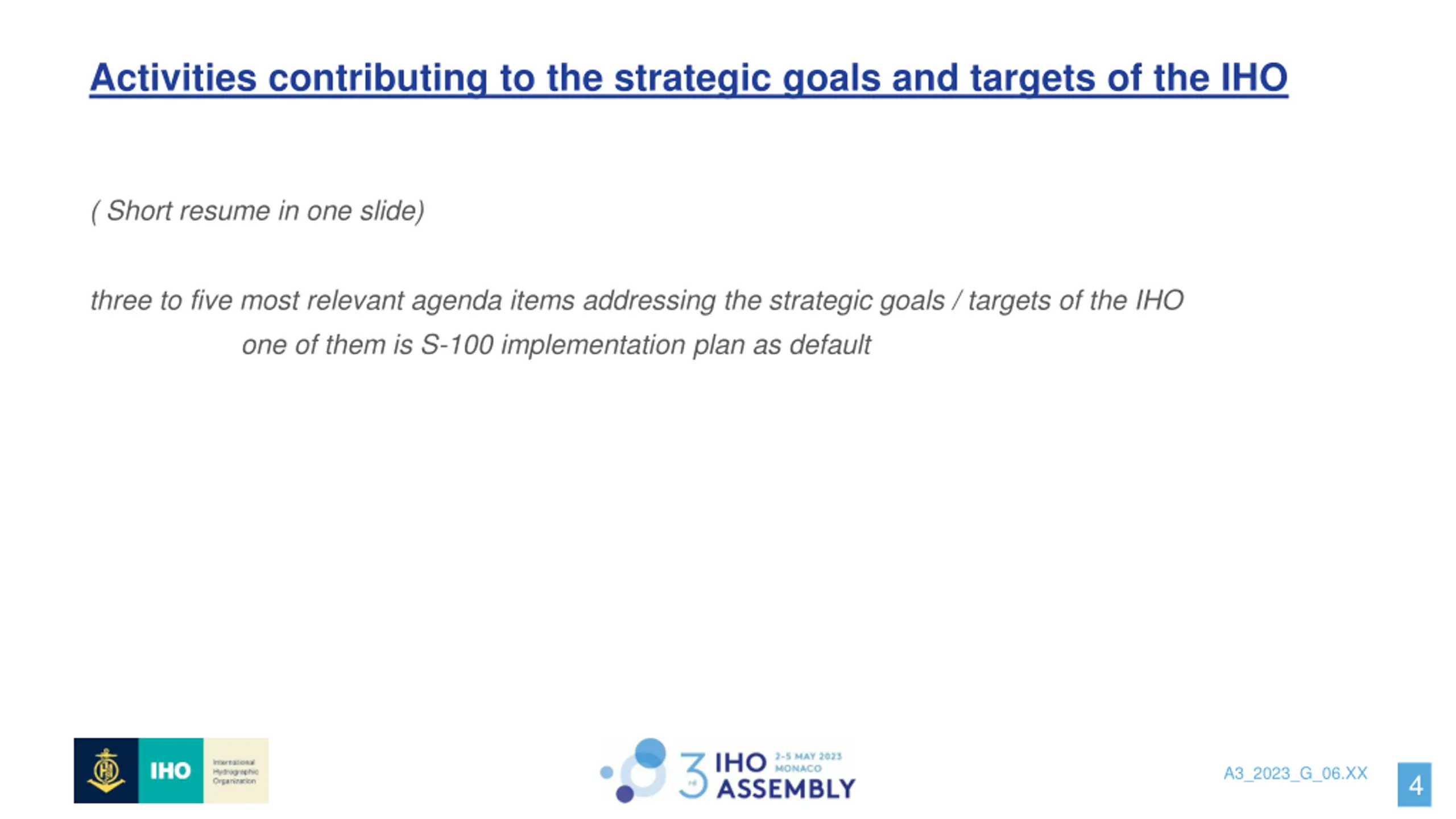 Activities contributing to the strategic goals and targets of the IHO ( Short resume in one slide) three to five most relevant agenda items addressing the strategic goals / targets of the IHO one of them is S-100 implementation plan as default A3_2023_G_06.XX 4