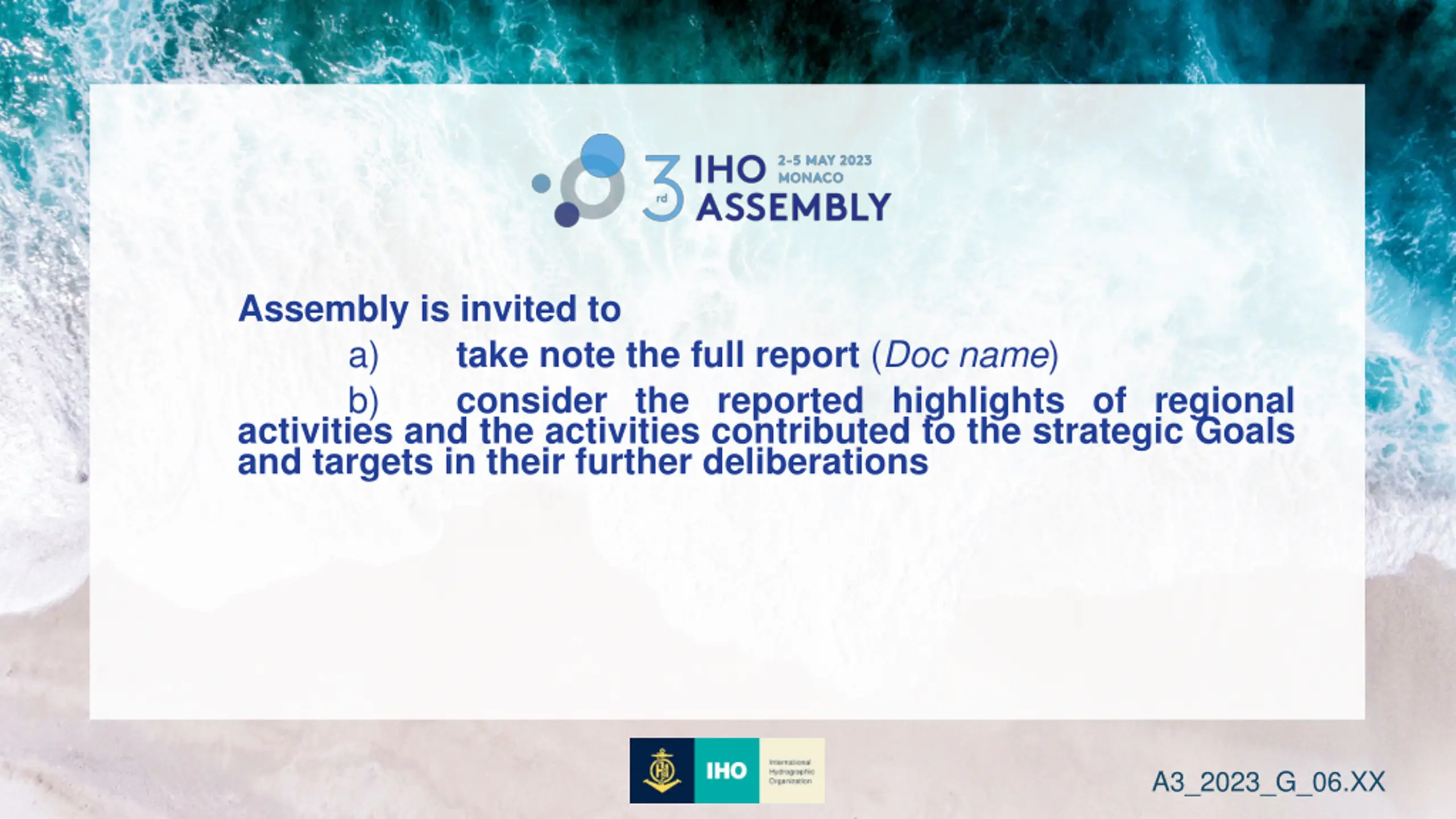 Assembly is invited to a) b) activities and the activities contributed to the strategic Goals and targets in their further deliberations take note the full report (Doc name) consider the reported highlights of regional A3_2023_G_06.XX