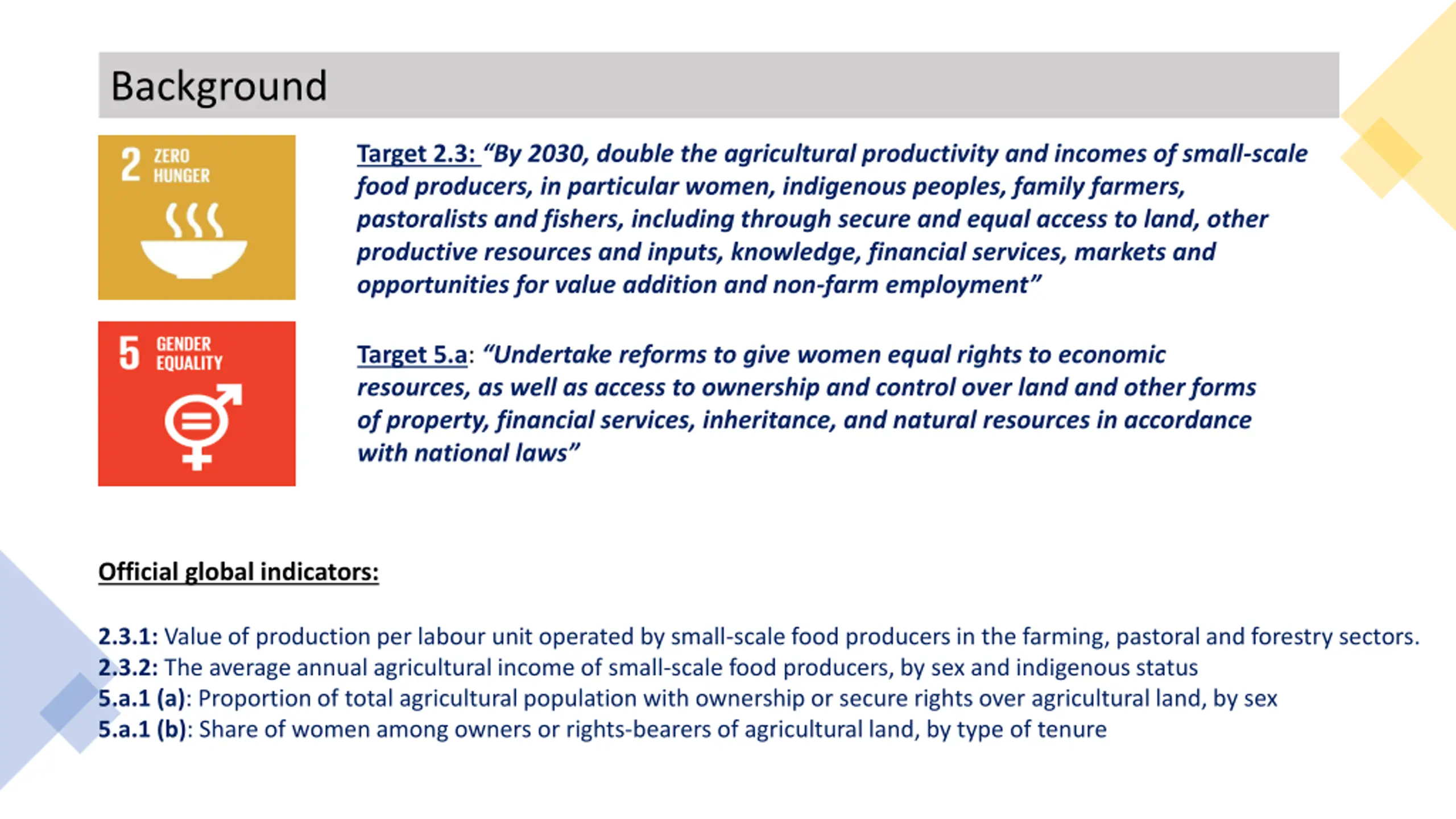 Background Target 2.3: By 2030, double the agricultural productivity and incomes of small-scale food producers, in particular women, indigenous peoples, family farmers, pastoralists and fishers, including through secure and equal access to land, other productive resources and inputs, knowledge, financial services, markets and opportunities for value addition and non-farm employment Target 5.a: Undertake reforms to give women equal rights to economic resources, as well as access to ownership and control over land and other forms of property, financial services, inheritance, and natural resources in accordance with national laws Official global indicators: 2.3.1: Value of production per labour unit operated by small-scale food producers in the farming, pastoral and forestry sectors. 2.3.2: The average annual agricultural income of small-scale food producers, by sex and indigenous status 5.a.1 (a): Proportion of total agricultural population with ownership or secure rights over agricultural land, by sex 5.a.1 (b): Share of women among owners or rights-bearers of agricultural land, by type of tenure