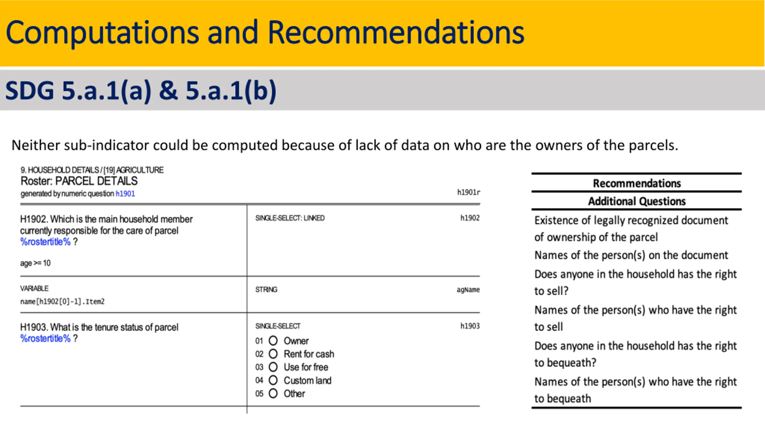 Computations and Recommendations Computations and Recommendations SDG 5.a.1(a) & 5.a.1(b) Neither sub-indicator could be computed because of lack of data on who are the owners of the parcels.