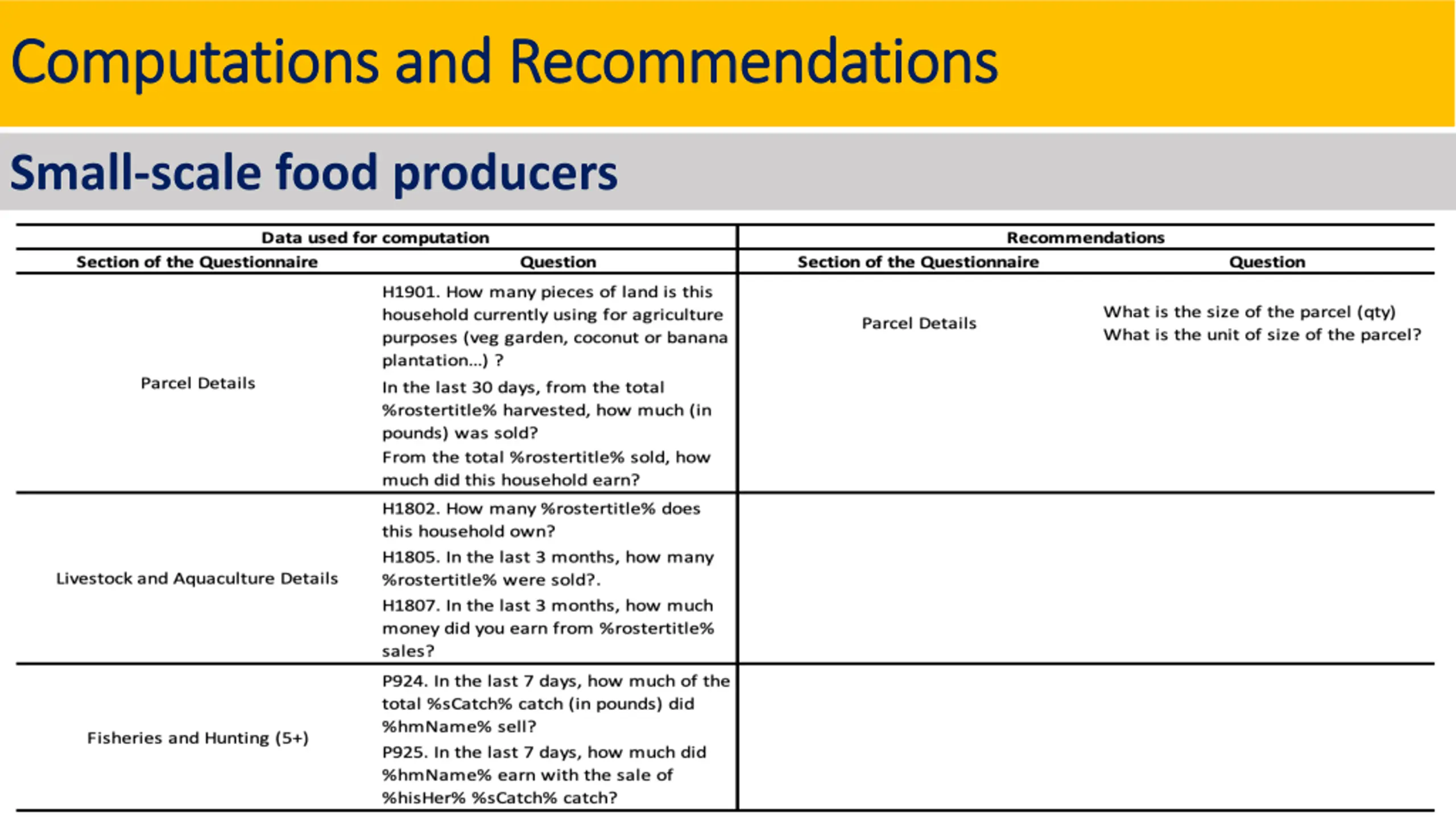 Computations and Recommendations Computations and Recommendations SDG 2.3.2 SDG 2.3.2 could be computed by using the data available in the questionnaire.