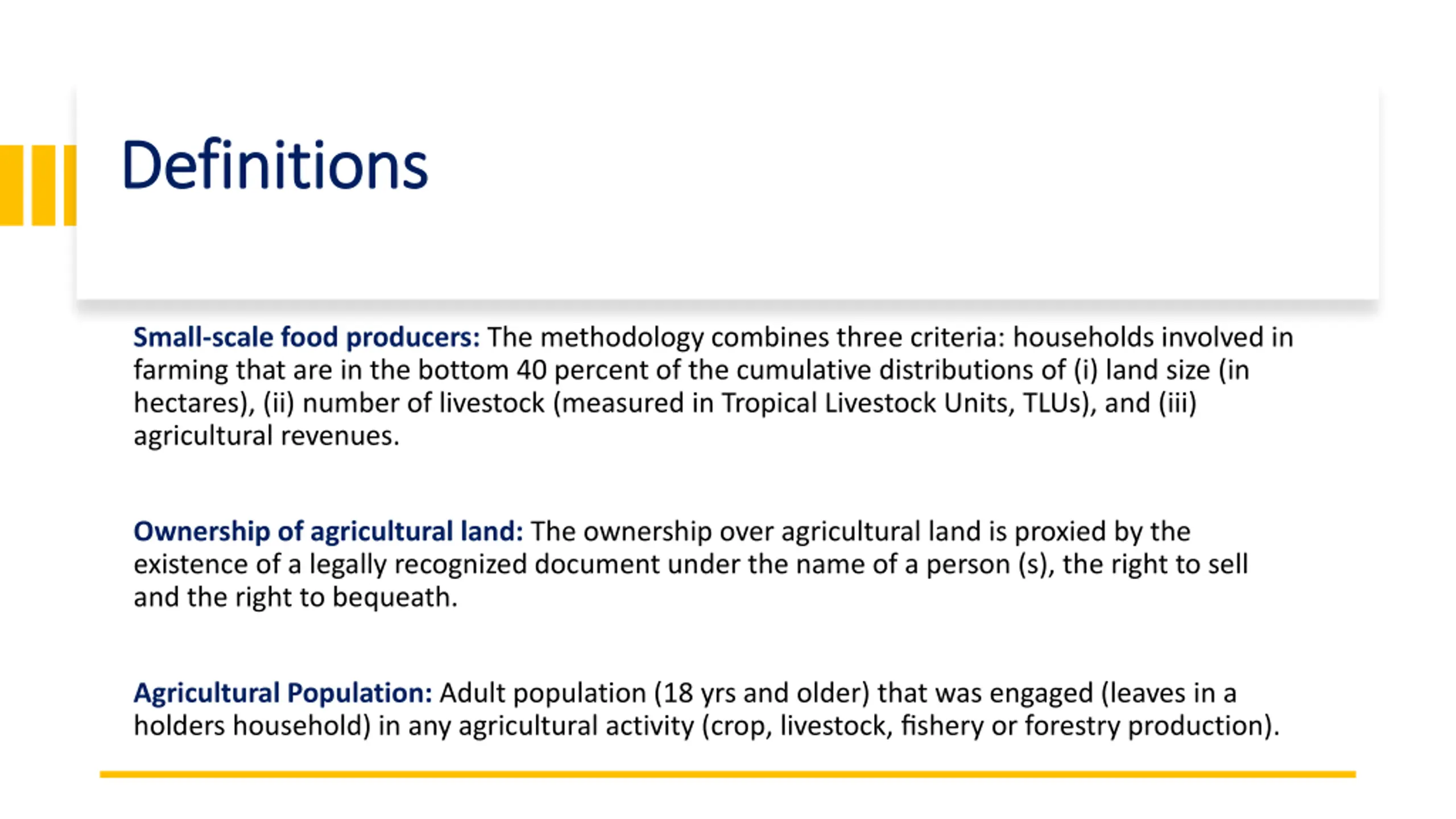 Definitions Definitions Small-scale food producers: The methodology combines three criteria: households involved in farming that are in the bottom 40 percent of the cumulative distributions of (i) land size (in hectares), (ii) number of livestock (measured in Tropical Livestock Units, TLUs), and (iii) agricultural revenues. Ownership of agricultural land: The ownership over agricultural land is proxied by the existence of a legally recognized document under the name of a person (s), the right to sell and the right to bequeath. Agricultural Population: Adult population (18 yrs and older) that was engaged (leaves in a holders household) in any agricultural activity (crop, livestock, fishery or forestry production).