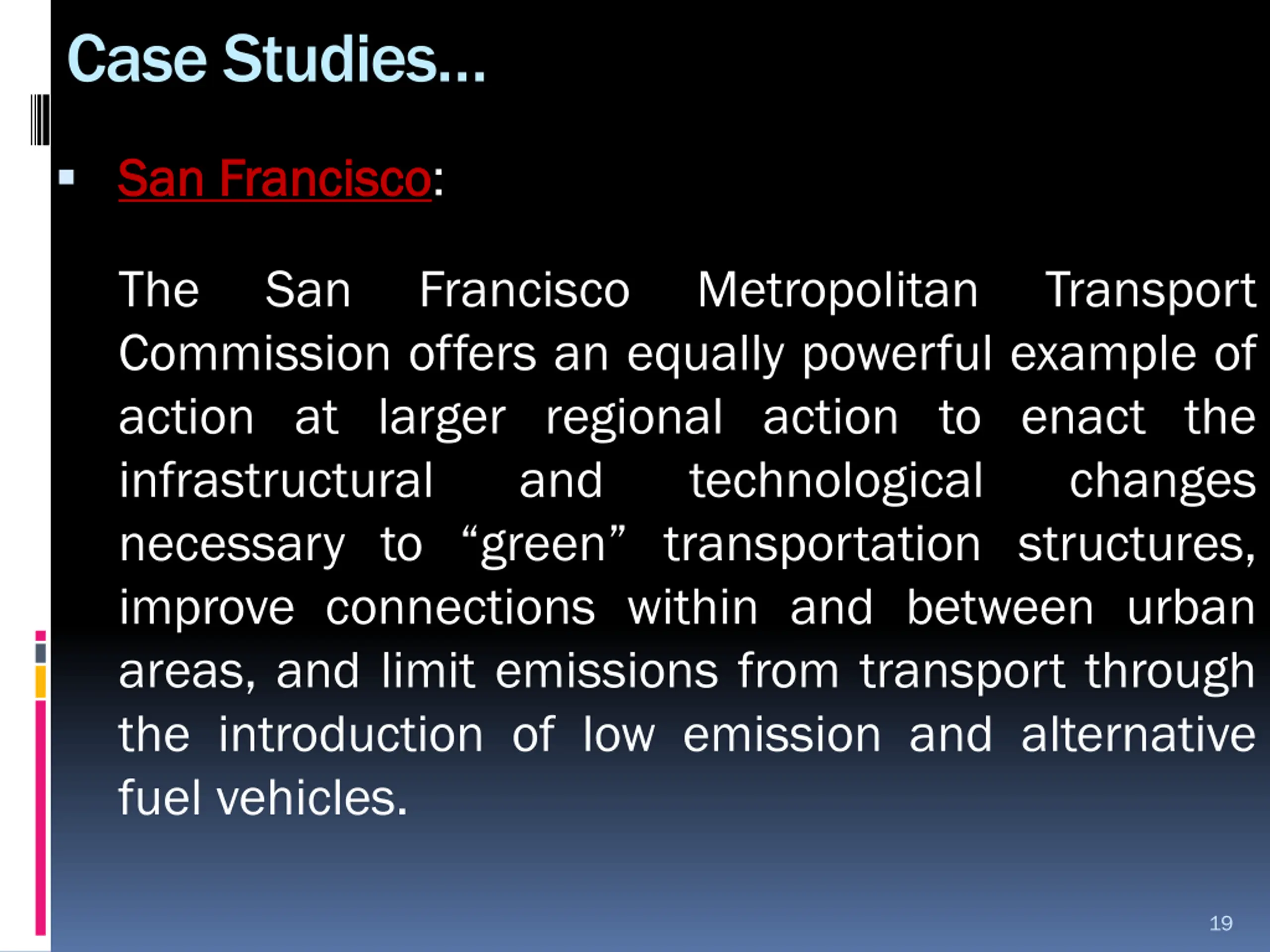 Case Studies San San Francisco Francisco: The Commission offers an equally powerful example of action at larger regional action to enact the infrastructural and technological necessary to green transportation structures, improve connections within and between urban areas, and limit emissions from transport through the introduction of low emission and alternative fuel vehicles. San Francisco Metropolitan Transport changes 19