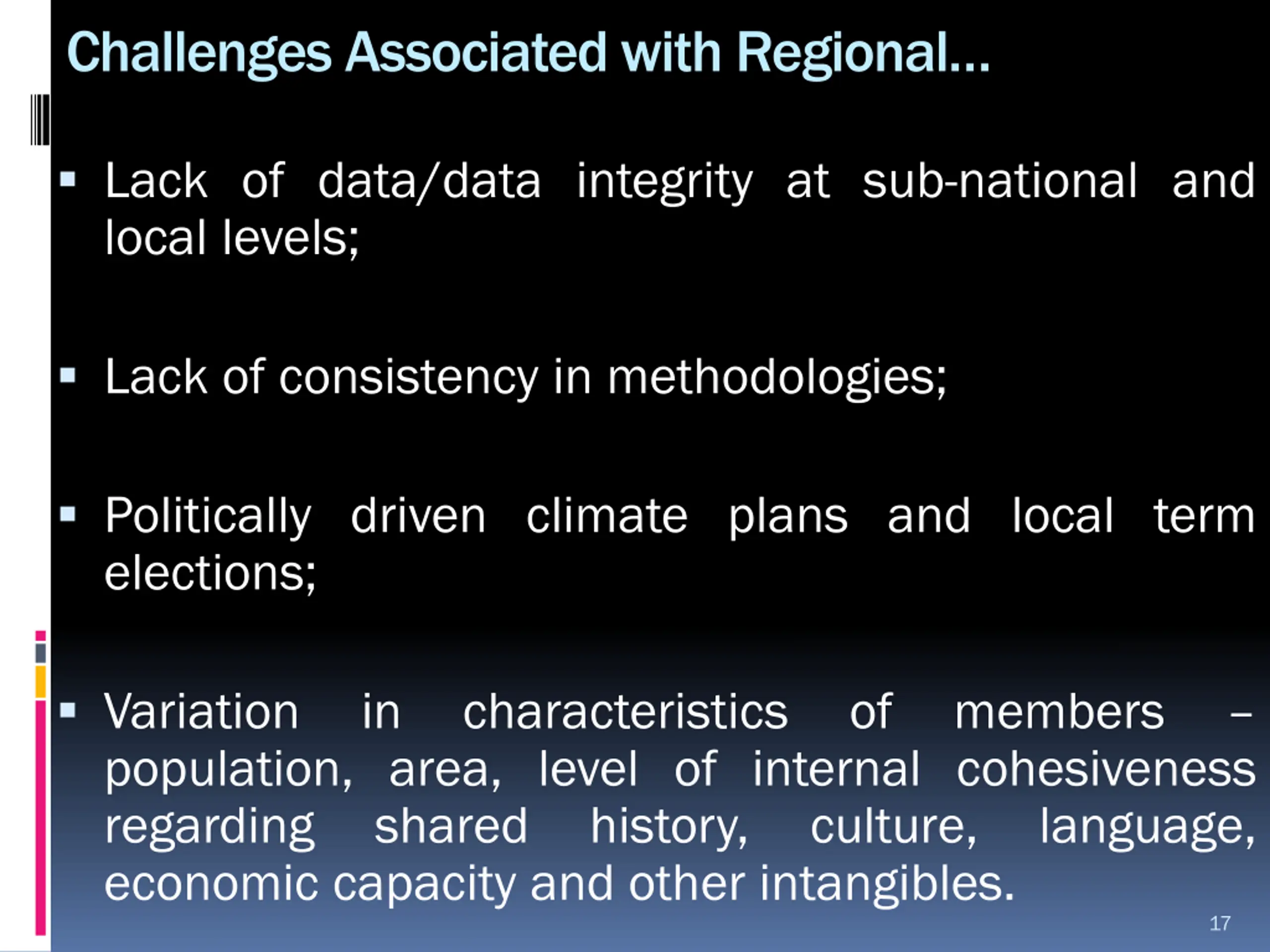 Challenges Associated with Regional Lack of data/data integrity at sub-national and local levels; Lack of consistency in methodologies; Politically driven climate plans and local term elections; Variation in characteristics of members population, area, level of internal cohesiveness regarding shared history, culture, language, economic capacity and other intangibles. 17