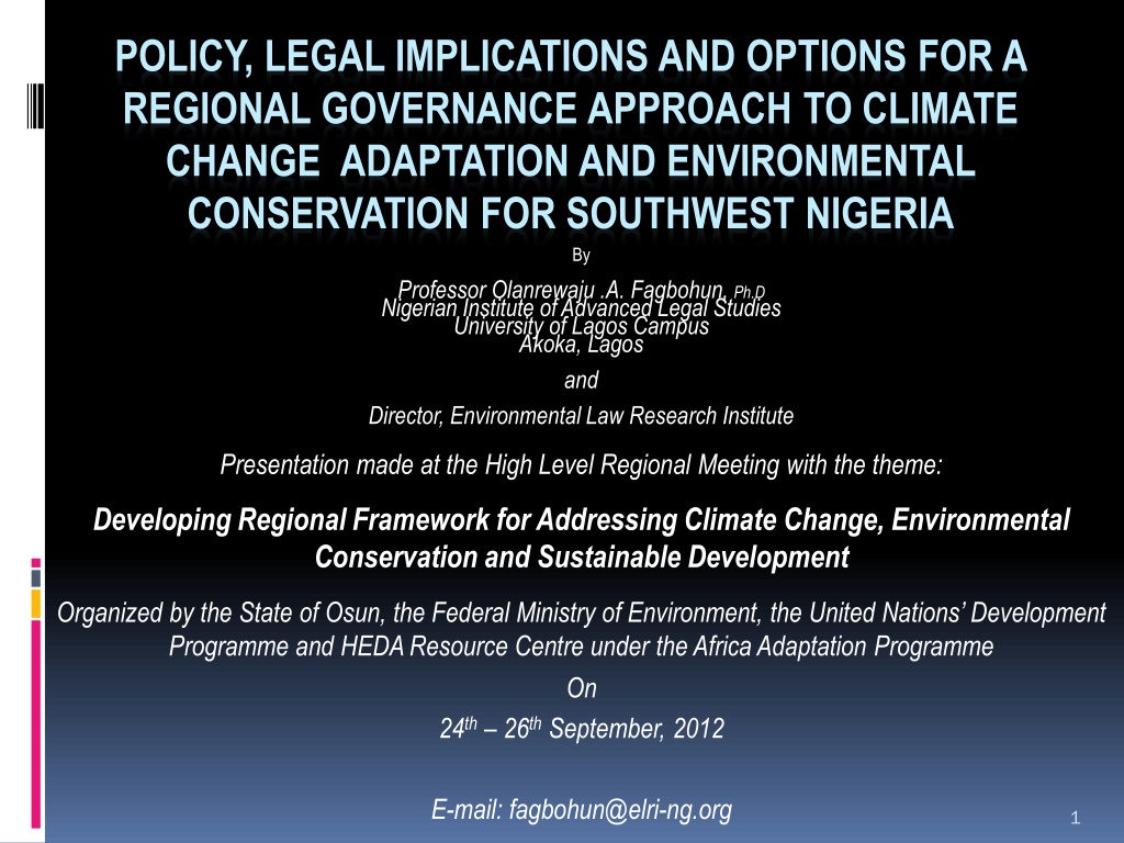 POLICY, LEGAL IMPLICATIONS AND OPTIONS FOR A REGIONAL GOVERNANCE APPROACH TO CLIMATE CHANGE ADAPTATION AND ENVIRONMENTAL CONSERVATION FOR SOUTHWEST NIGERIA By Professor Olanrewaju .A. Fagbohun, Ph.D Nigerian Institute of Advanced Legal Studies University of Lagos Campus Akoka, Lagos and Director, Environmental Law Research Institute Presentation made at the High Level Regional Meeting with the theme: Developing Regional Framework for Addressing Climate Change, Environmental Conservation and Sustainable Development Organized by the State of Osun, the Federal Ministry of Environment, the United Nations Development Programme and HEDA Resource Centre under the Africa Adaptation Programme On 24th 26thSeptember, 2012 E-mail: fagbohun@elri-ng.org 1