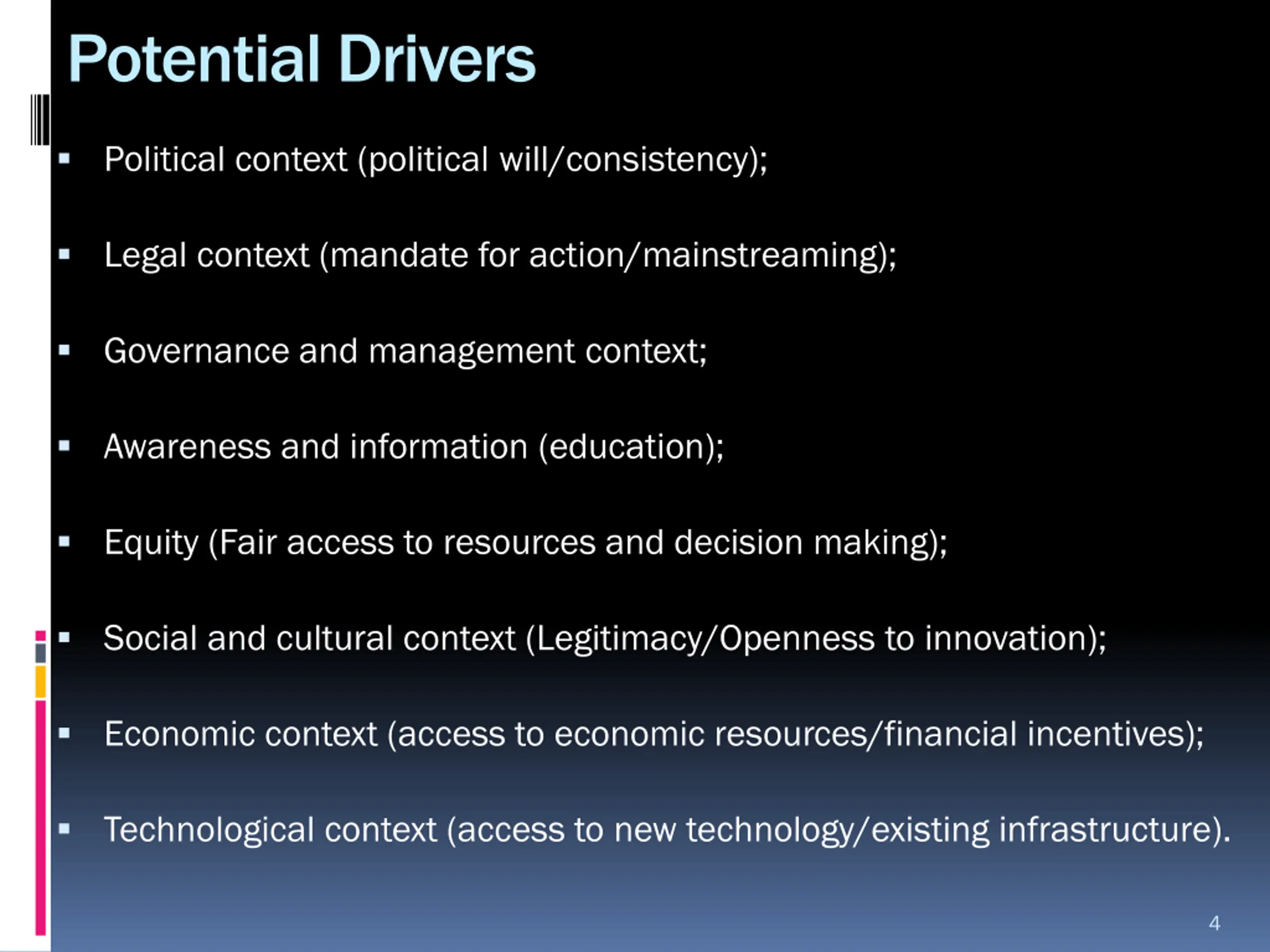 Potential Drivers Political context (political will/consistency); Legal context (mandate for action/mainstreaming); Governance and management context; Awareness and information (education); Equity (Fair access to resources and decision making); Social and cultural context (Legitimacy/Openness to innovation); Economic context (access to economic resources/financial incentives); Technological context (access to new technology/existing infrastructure). 4