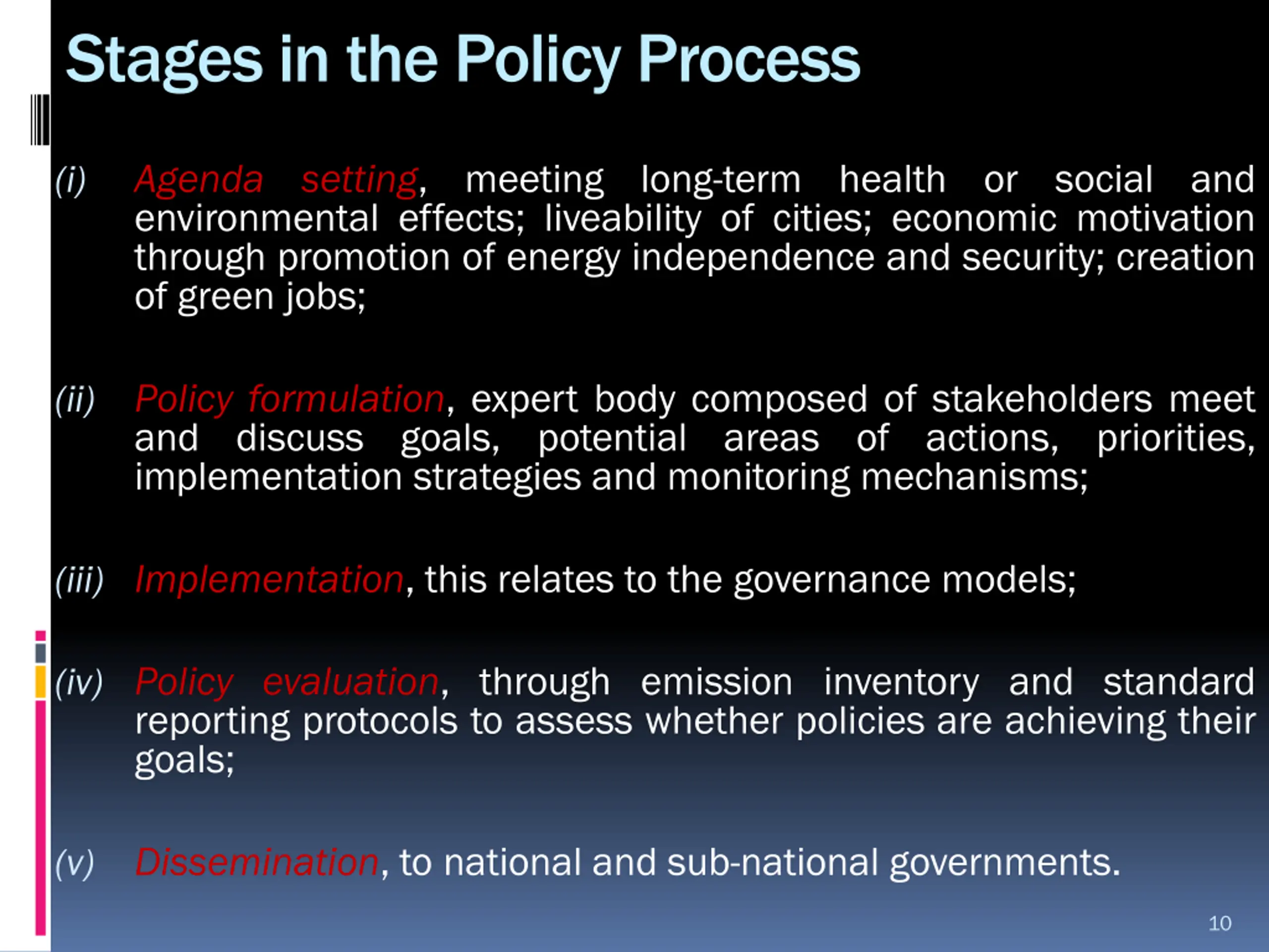 Stages in the Policy Process Agenda setting,meeting long-term health or social and environmental effects; liveability of cities; economic motivation through promotion of energy independence and security; creation of green jobs; (i) Policy formulation,expert body composed of stakeholders meet and discuss goals, potential areas of actions, priorities, implementation strategies and monitoring mechanisms; (ii) (iii) Implementation,this relates to the governance models; (iv) Policy evaluation,through emission inventory and standard reporting protocols to assess whether policies are achieving their goals; Dissemination,to national and sub-national governments. (v) 10