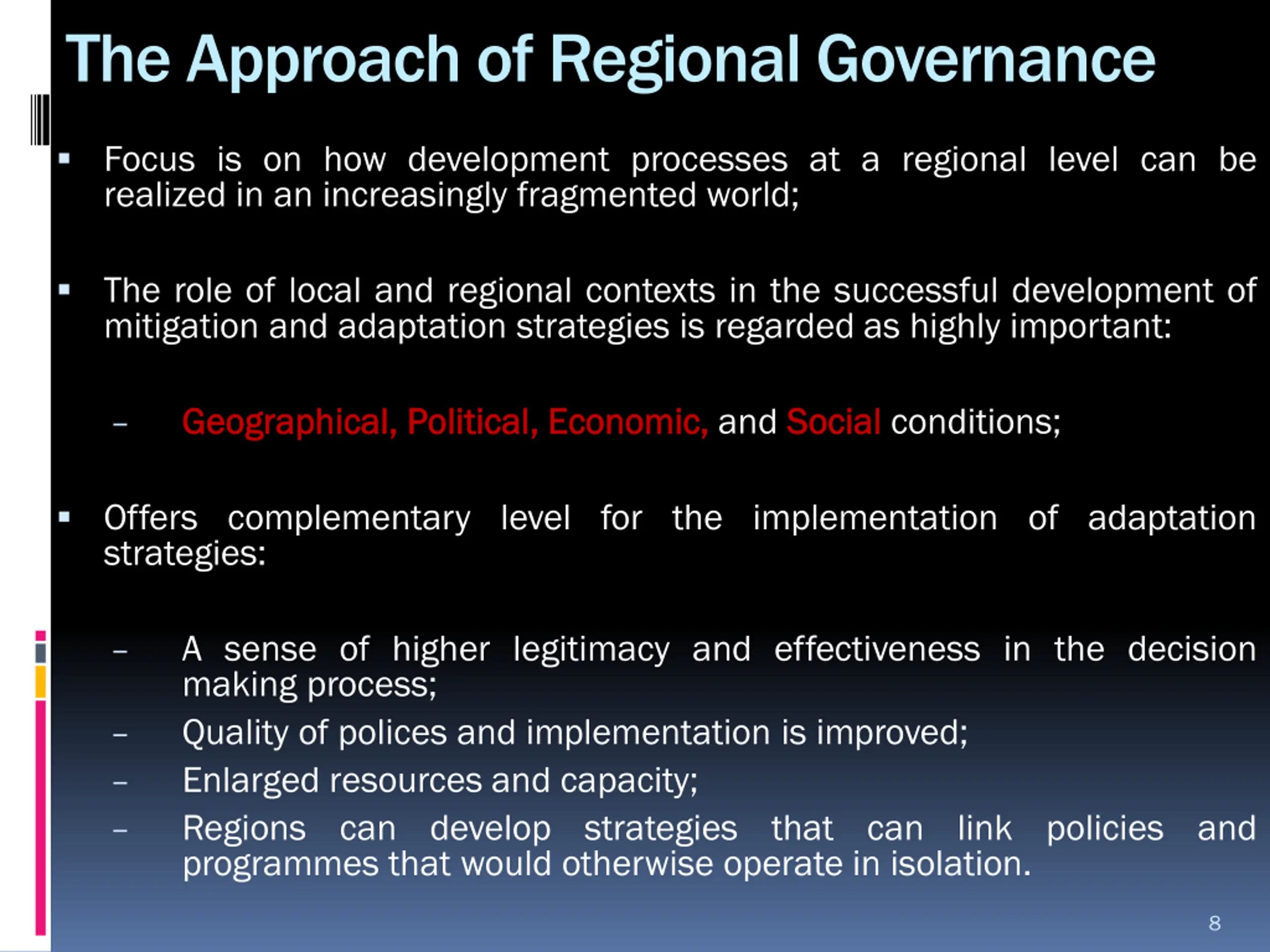 The Approach of Regional Governance Focus is on how development processes at a regional level can be realized in an increasingly fragmented world; The role of local and regional contexts in the successful development of mitigation and adaptation strategies is regarded as highly important: Geographical, Geographical, Political, Political, Economic, Economic, and Social Social conditions; Offers complementary level for the implementation of adaptation strategies: A sense of higher legitimacy and effectiveness in the decision making process; Quality of polices and implementation is improved; Enlarged resources and capacity; Regions can develop strategies that can link policies and programmes that would otherwise operate in isolation. 8