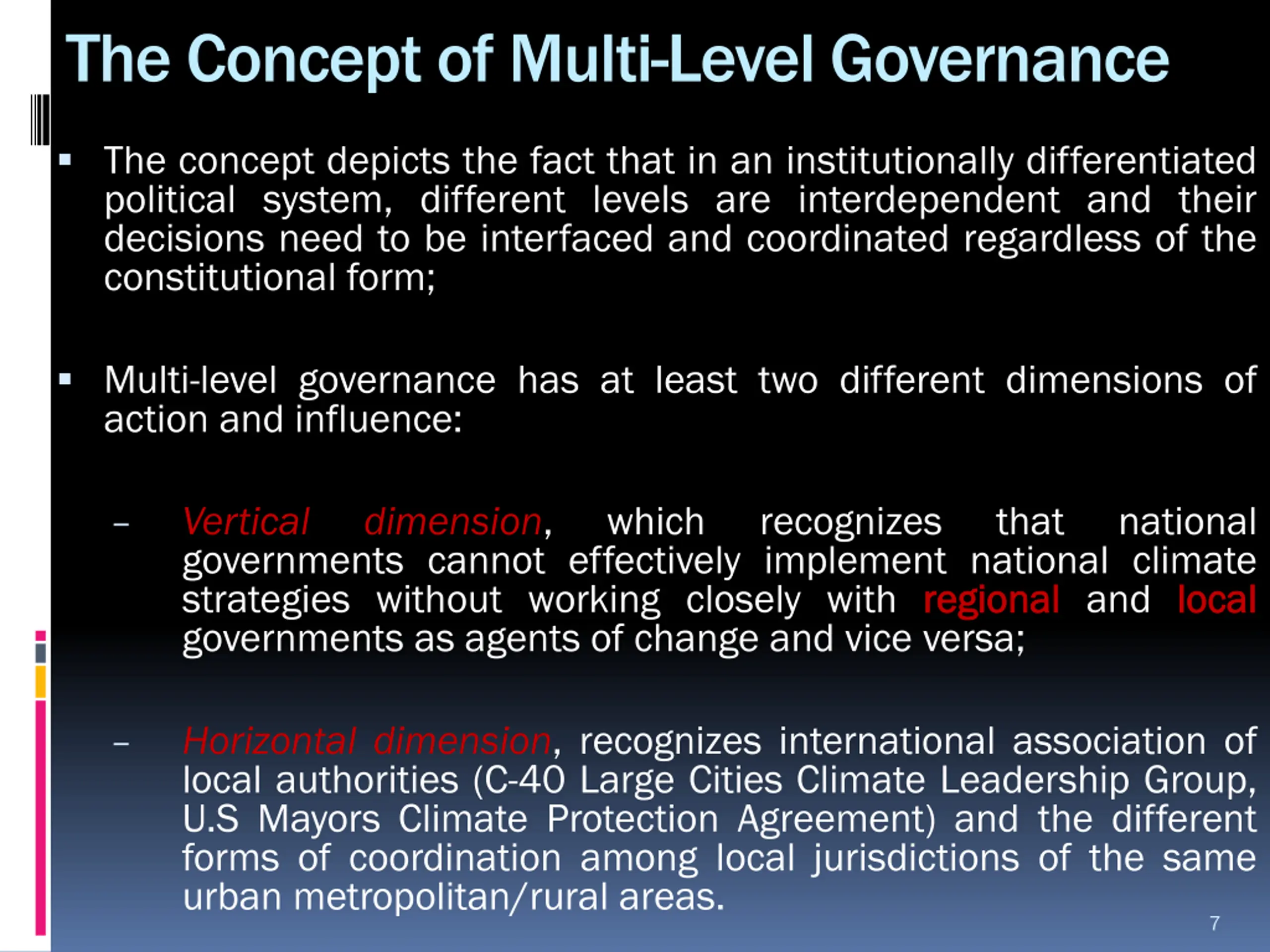 The Concept of Multi-Level Governance The concept depicts the fact that in an institutionally differentiated political system, different levels are interdependent and their decisions need to be interfaced and coordinated regardless of the constitutional form; Multi-level governance has at least two different dimensions of action and influence: Vertical governments cannot effectively implement national climate strategies without working closely with regional governments as agents of change and vice versa; dimension, which recognizes that national regional and local local Horizontal dimension, recognizes international association of local authorities (C-40 Large Cities Climate Leadership Group, U.S Mayors Climate Protection Agreement) and the different forms of coordination among local jurisdictions of the same urban metropolitan/rural areas. 7