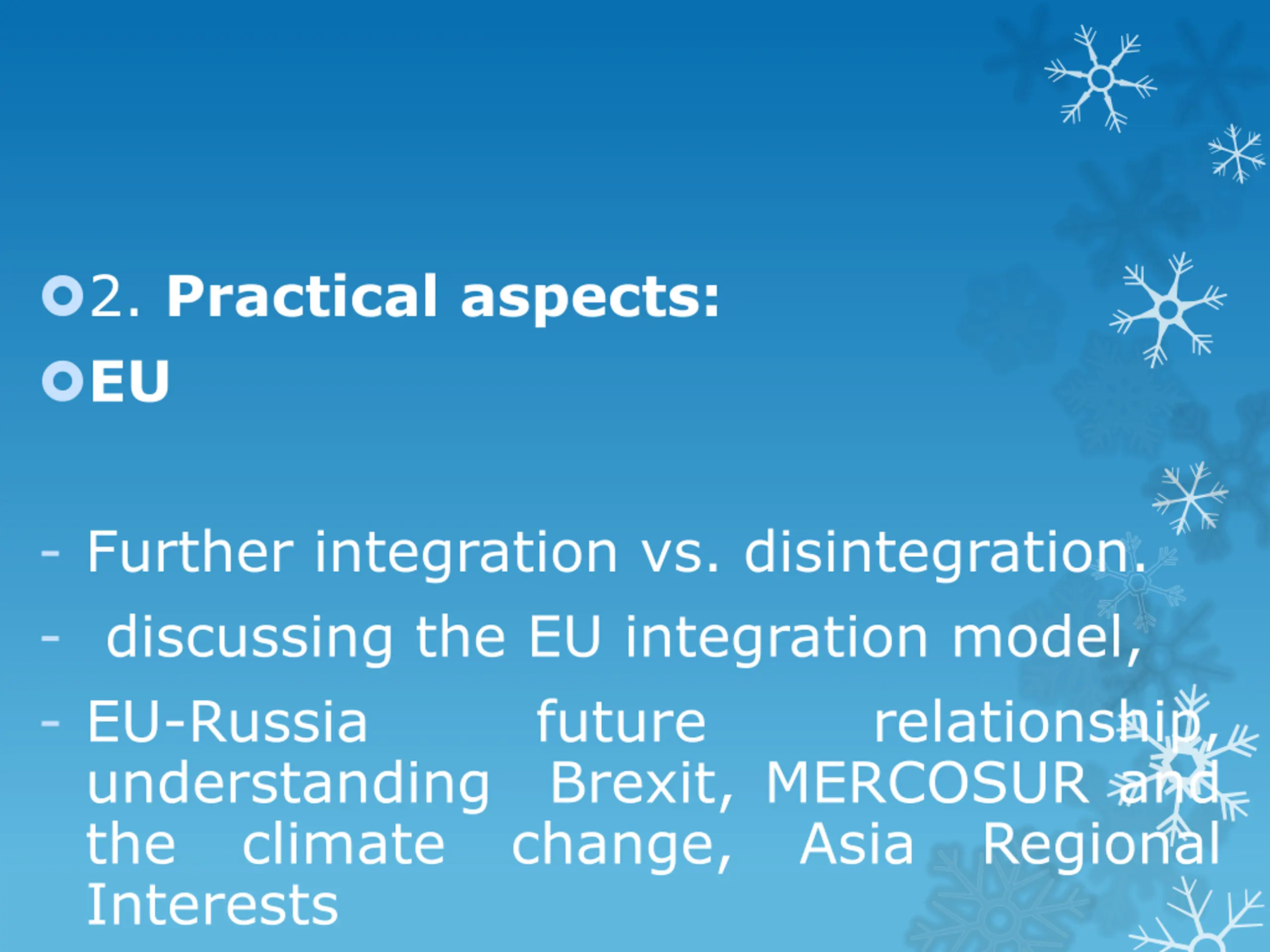2. Practical aspects: EU - Further integration vs. disintegration. - discussing the EU integration model, - EU-Russia future understanding Brexit, MERCOSUR and the climate change, Interests relationship, Asia Regional