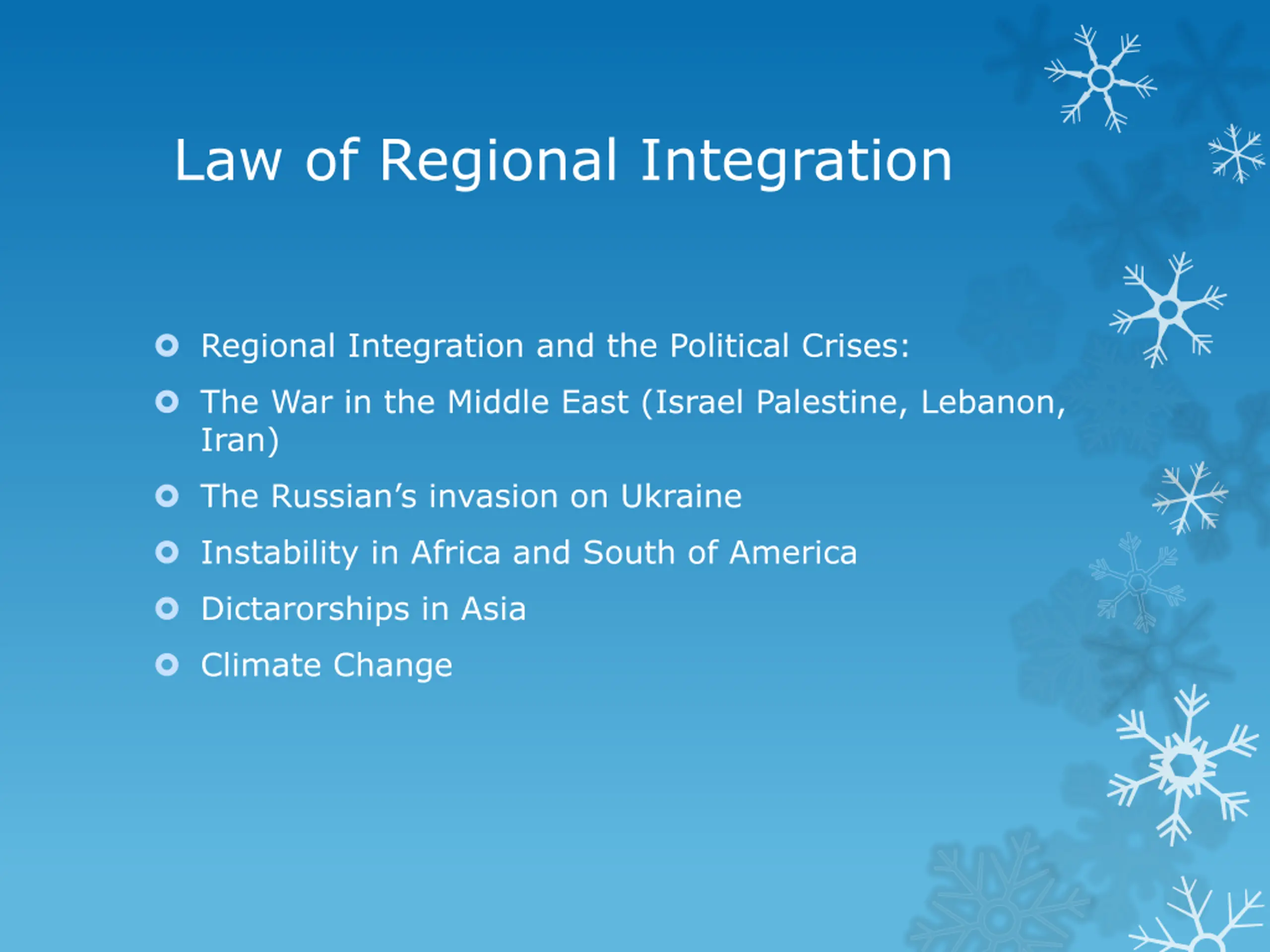 Law of Regional Integration Regional Integration and the Political Crises: The War in the Middle East (Israel Palestine, Lebanon, Iran) The Russian s invasion on Ukraine Instability in Africa and South of America Dictarorships in Asia Climate Change