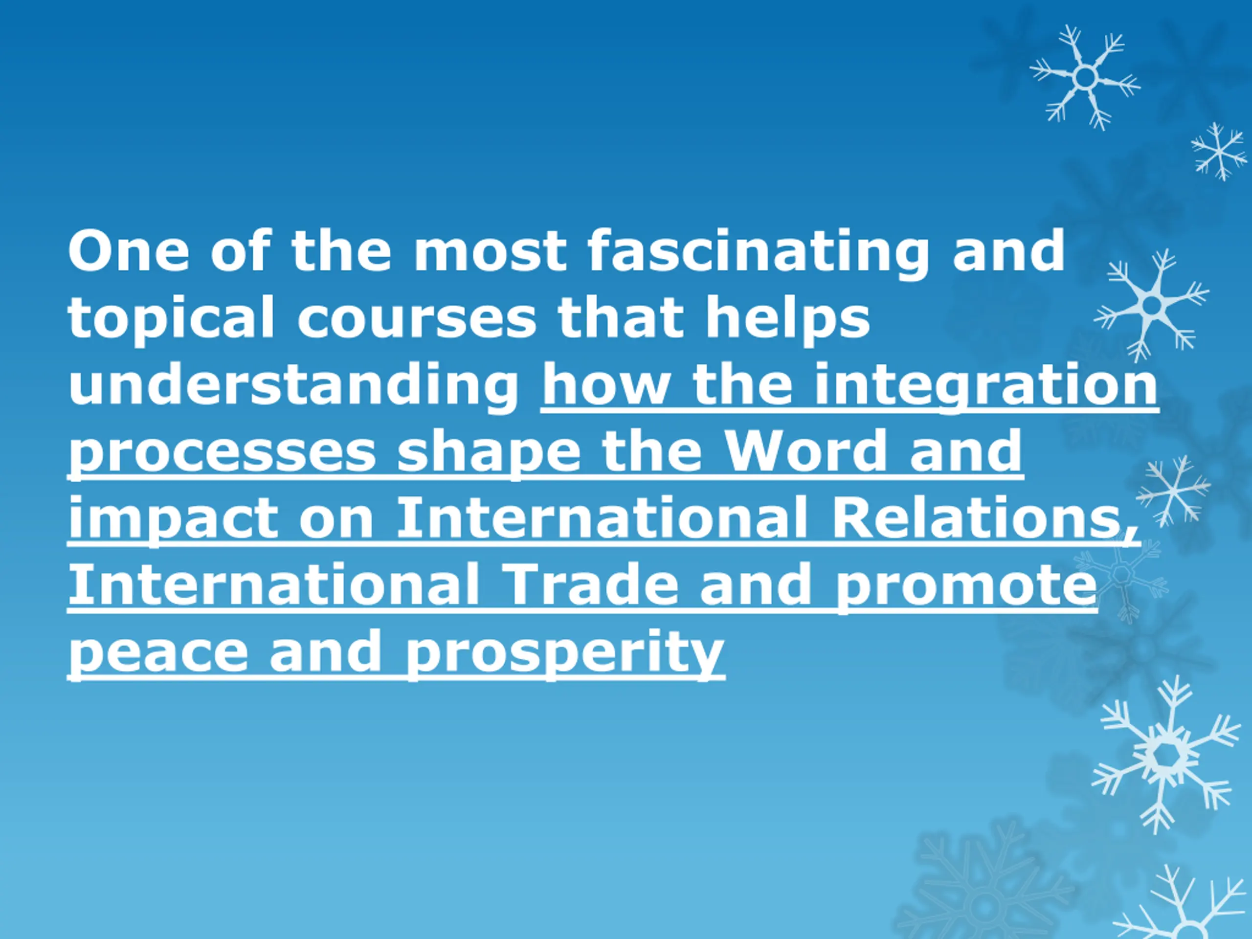 One of the most fascinating and topical courses that helps understanding how the integration processes shape the Word and impact on International Relations, International Trade and promote peace and prosperity