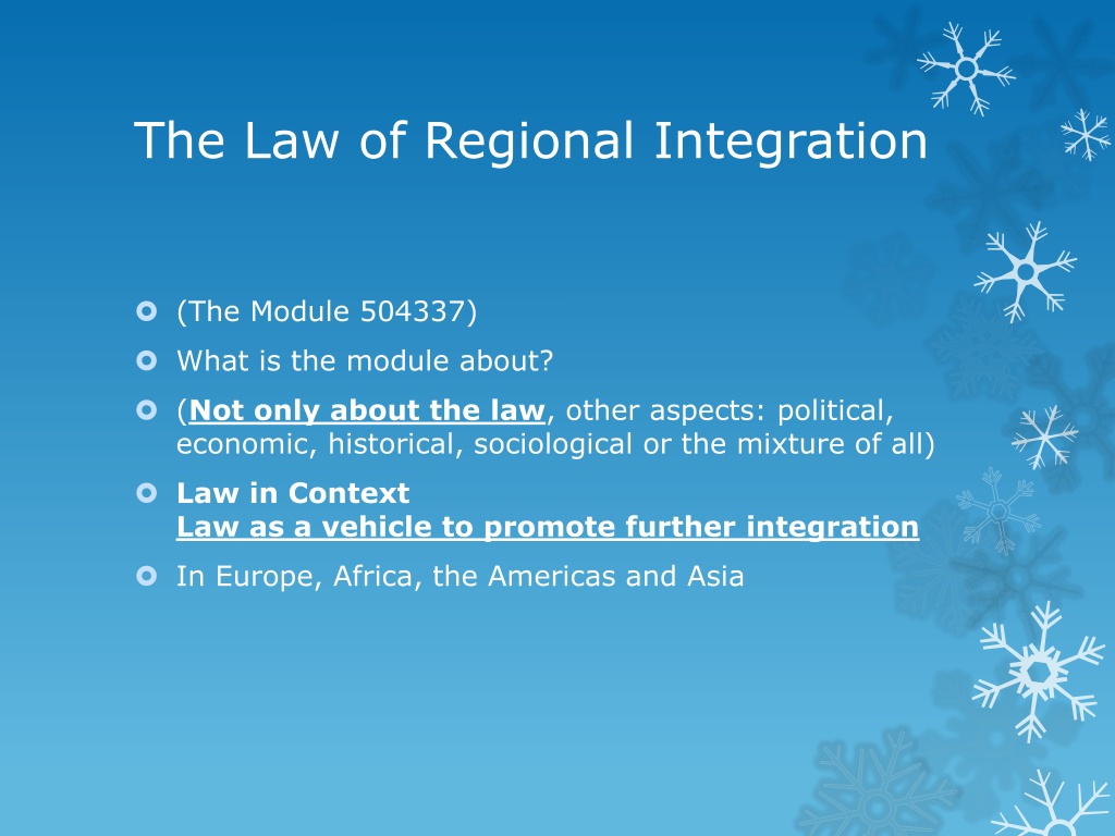 The Law of Regional Integration (The Module 504337) What is the module about? (Not only about the law, other aspects: political, economic, historical, sociological or the mixture of all) Law in Context Law as a vehicle to promote further integration In Europe, Africa, the Americas and Asia