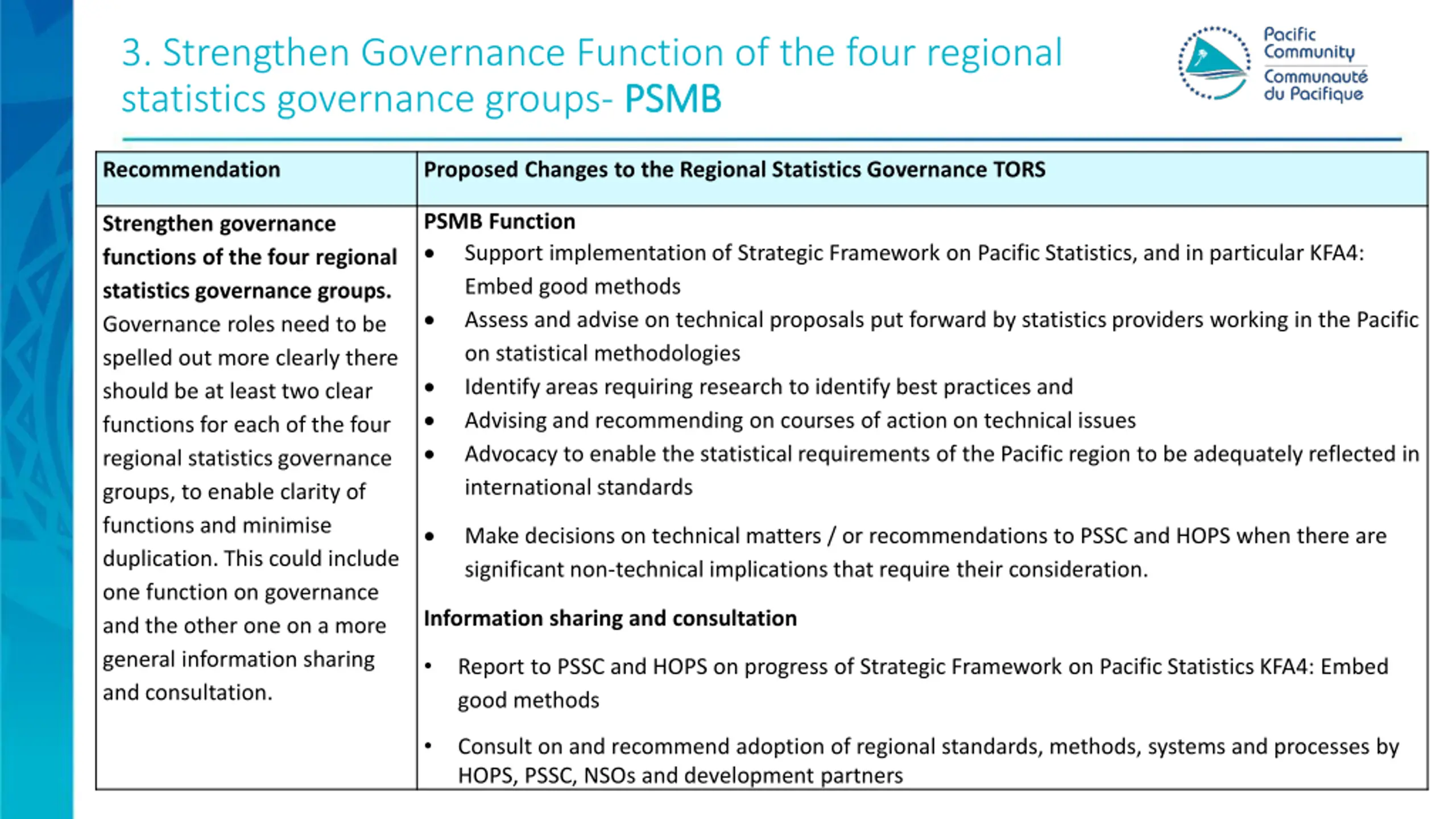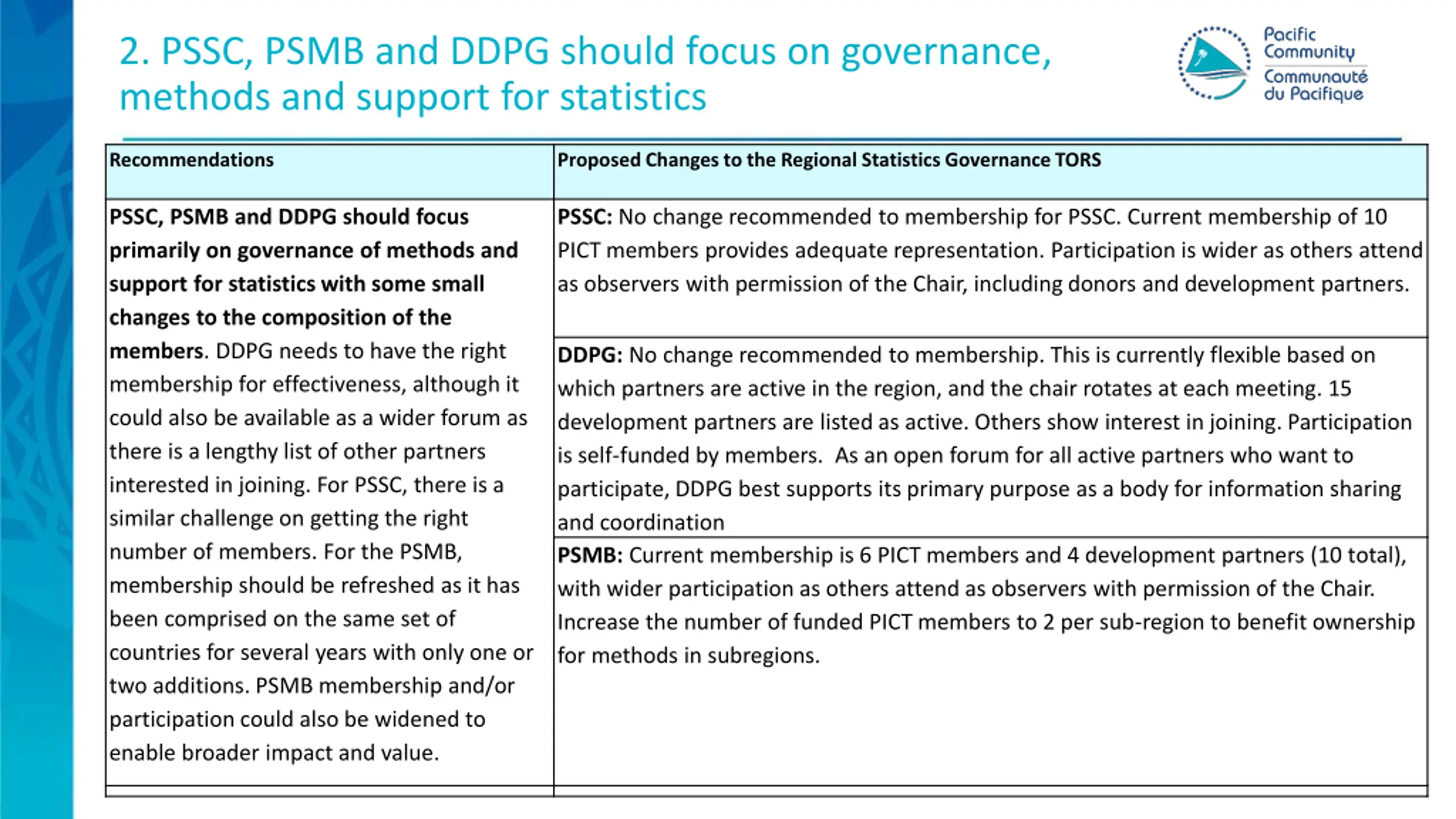 2. PSSC, PSMB and DDPG should focus on governance, methods and support for statistics Recommendations Proposed Changes to the Regional Statistics Governance TORS PSSC, PSMB and DDPG should focus primarily on governance of methods and support for statistics with some small changes to the composition of the members. DDPG needs to have the right membership for effectiveness, although it could also be available as a wider forum as there is a lengthy list of other partners interested in joining. For PSSC, there is a similar challenge on getting the right number of members. For the PSMB, membership should be refreshed as it has been comprised on the same set of countries for several years with only one or two additions. PSMB membership and/or participation could also be widened to enable broader impact and value. PSSC: No change recommended to membership for PSSC. Current membership of 10 PICT members provides adequate representation. Participation is wider as others attend as observers with permission of the Chair, including donors and development partners. DDPG: No change recommended to membership. This is currently flexible based on which partners are active in the region, and the chair rotates at each meeting. 15 development partners are listed as active. Others show interest in joining. Participation is self-funded by members. As an open forum for all active partners who want to participate, DDPG best supports its primary purpose as a body for information sharing and coordination PSMB: Current membership is 6 PICT members and 4 development partners (10 total), with wider participation as others attend as observers with permission of the Chair. Increase the number of funded PICT members to 2 per sub-region to benefit ownership for methods in subregions.