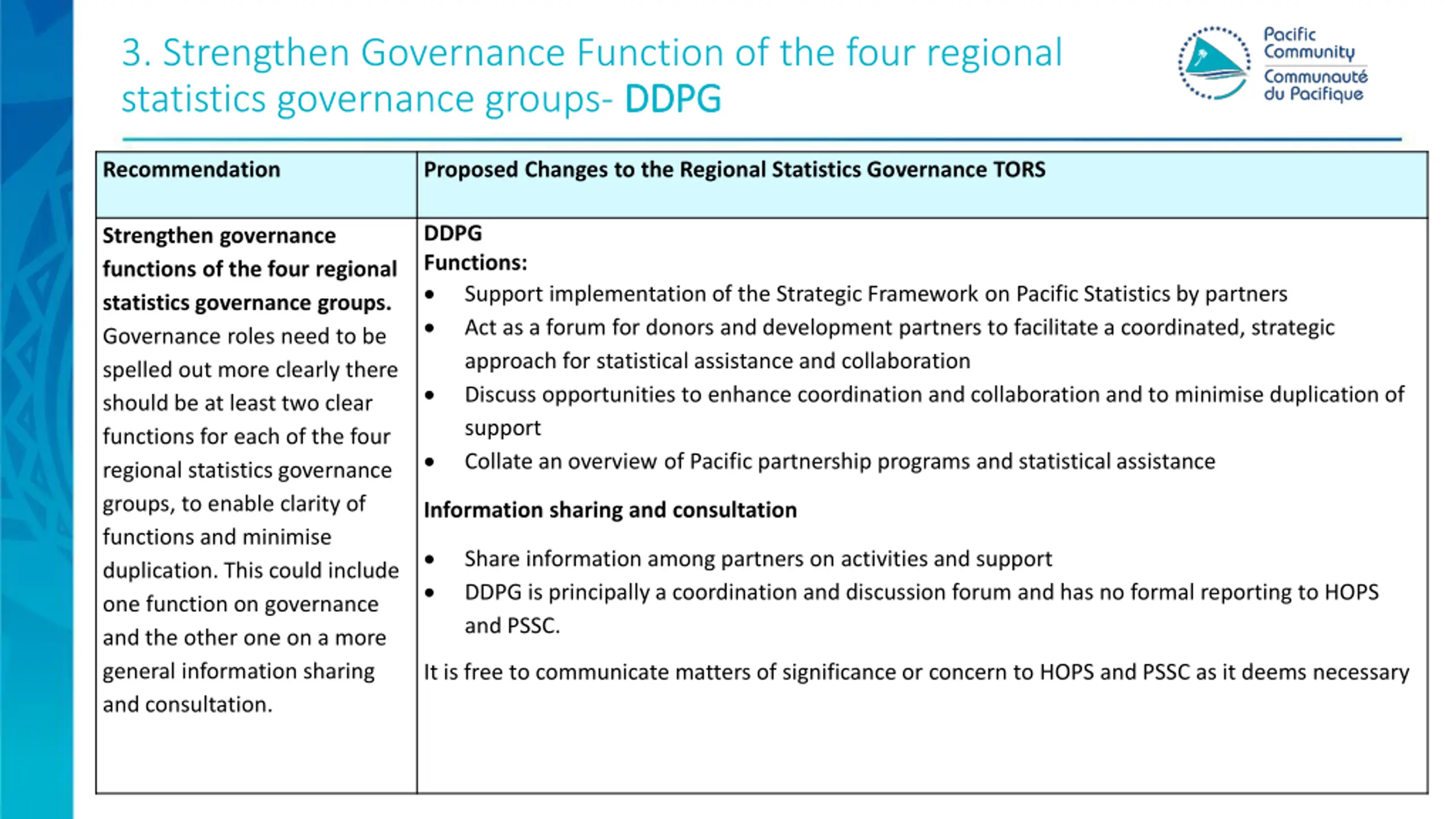 3. Strengthen Governance Function of the four regional statistics governance groups- DDPG DDPG Recommendation Proposed Changes to the Regional Statistics Governance TORS DDPG Functions: Support implementation of the Strategic Framework on Pacific Statistics by partners Act as a forum for donors and development partners to facilitate a coordinated, strategic approach for statistical assistance and collaboration Discuss opportunities to enhance coordination and collaboration and to minimise duplication of support Collate an overview of Pacific partnership programs and statistical assistance Strengthen governance functions of the four regional statistics governance groups. Governance roles need to be spelled out more clearly there should be at least two clear functions for each of the four regional statistics governance groups, to enable clarity of functions and minimise duplication. This could include one function on governance and the other one on a more general information sharing and consultation. Information sharing and consultation Share information among partners on activities and support DDPG is principally a coordination and discussion forum and has no formal reporting to HOPS and PSSC. It is free to communicate matters of significance or concern to HOPS and PSSC as it deems necessary